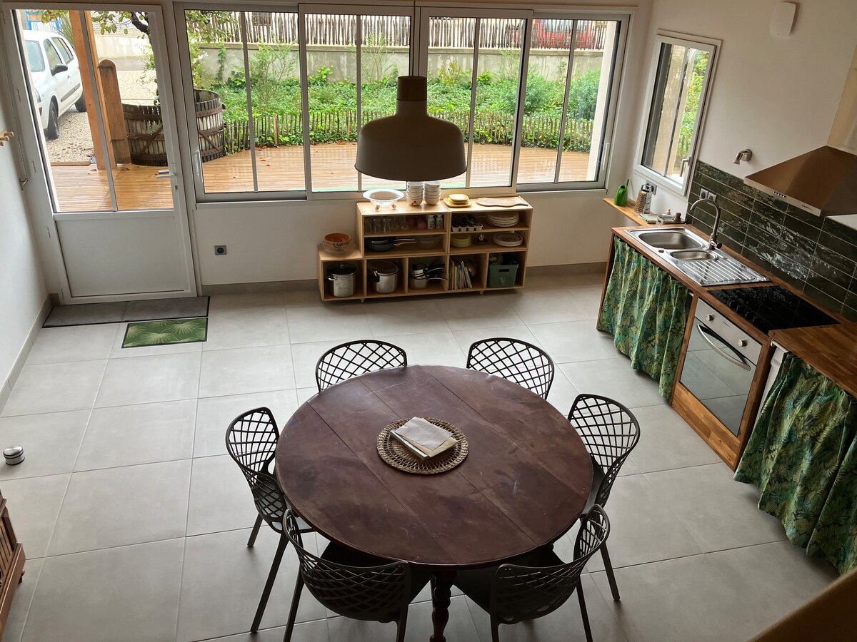 Fullstendig renovert hus med plass til opptil fem personer i sentrum av Port d 'Envaux, 50 meter fra Charente. Nylig rangert 3 ✯✯✯ av Charentes Tourisme. I første etasje, kjøkken i åpen planløsning i spisestuen og separat inngang. I første etasje, to uavhengige soverom med dobbeltsenger og dressinger. Bad med massasjestråler dusj. I andre etasje (utsikt over Charente), en seng for voksne, utstyr for en baby og avslapningsområde (sofa, avslapning, brettspill).