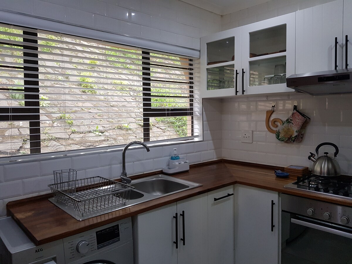 Plassert i den rolige landsbyen Southbroom. Fem minutters gange fra stranden. Koselig stue med smart-TV og HDMI-kabel for å spille av Netflix (ved hjelp av din egen pålogging), Youtube (tilgjengelig) og surfe på internett. Tekjøkken, spiseplass, dusj og romslig soverom med super kingsize-seng og fantastisk havutsikt. Sikkerhet med væpnet respons. 5000 liters JOJO-tank for vannreserve. Omformer og solcellepaneler for strømforsyning. Lastdeling og vannskifte påvirker deg ikke. Låsbar garasje.