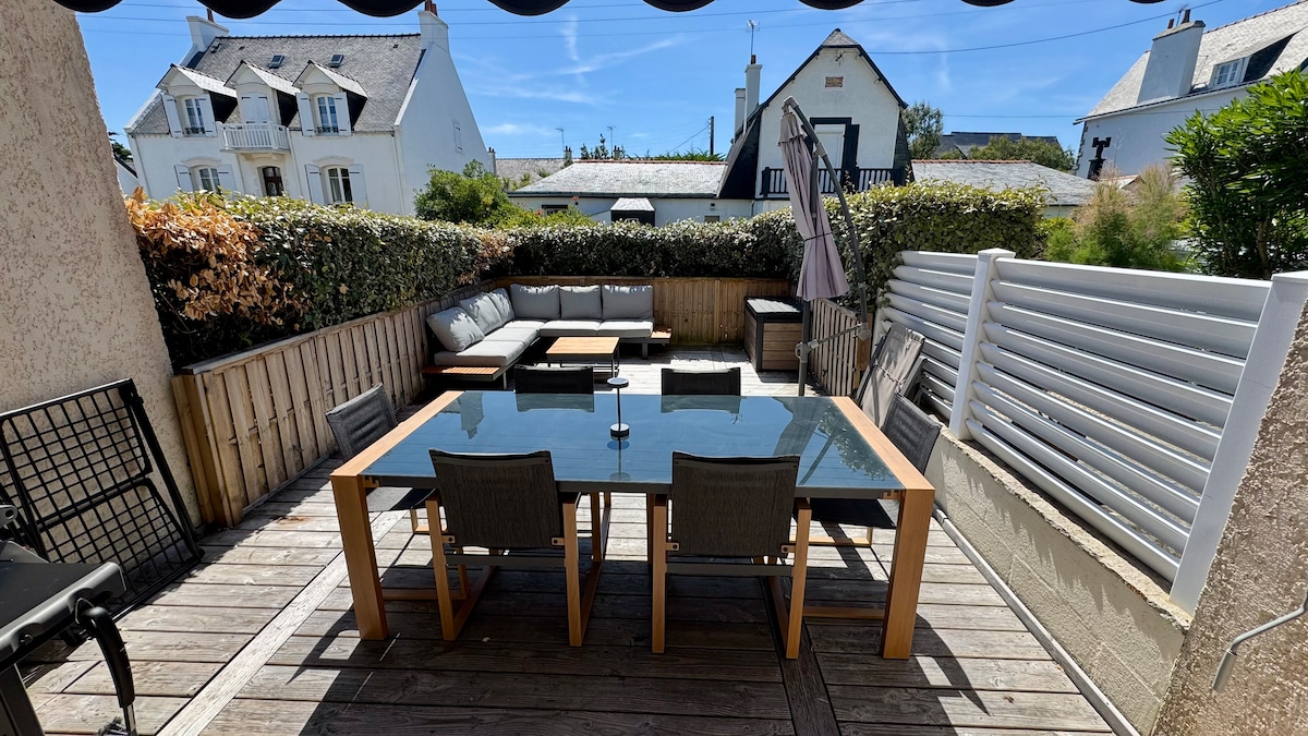 I sentrum av Quiberon, alt til fots. Hyggelig og rolig leilighet på 50 m2, med en flott terrasse vendt sørover mot den store stranden. Stor stue med kjøkken, soverom med kingsize-seng, bad, separat toalett. Kjøkken med oppvaskmaskin, ovn, mikrobølgeovn, vaskemaskin, nespresso, airfryer, racletteapparat. Terrasse med utendørsbord og liggestoler. Elektrisk markise. Privat parkering (smal adkomst se bilde). TV, HIFI-radio, internett. Sengetøy inkludert ved opphold på minimum 7 netter.