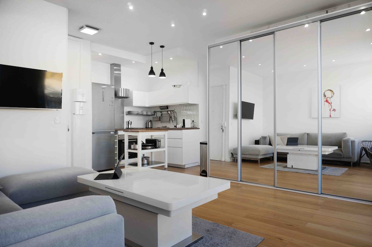 Nyt en stilfull opplevelse på et sted med sentral beliggenhet, nettopp fornyet på et unikt sted i den vakre havnen i Nice, det mest etterspurte området i byen. Barnevennlig. Avstander: nær alle attraksjoner i området, 300 meter fra den vakre bukten La Reserve, ti minutter til Villefrenche, 20 minutter fra Monaco, seks minutter til fots fra Promenade des Anglais, 100 meter fra flytrikken, 20 minutter fra Antibes og 30 minutter fra Cannes. Det rette stedet å oppdage Cote d'Azur.