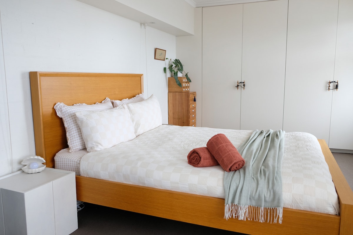 Velutstyrt studioleilighet med den beste beliggenheten! Bare to minutters gange til stranden, tre minutters gange til alle de fantastiske butikkene, barene og restaurantene i Bay Street, og bare fem minutters gange til lettbanen som tar deg direkte til CBD. Det er gratis gateparkering. Leiligheten har en komfortabel skinnsofa, TV, ubegrenset trådløst nettverk, en king size storslått seng. Kompakt kjøkken har en konveksjons-/mikrobølgeovn, airfryer, toastmaskin, riskoker med servise, bestikk, glass.