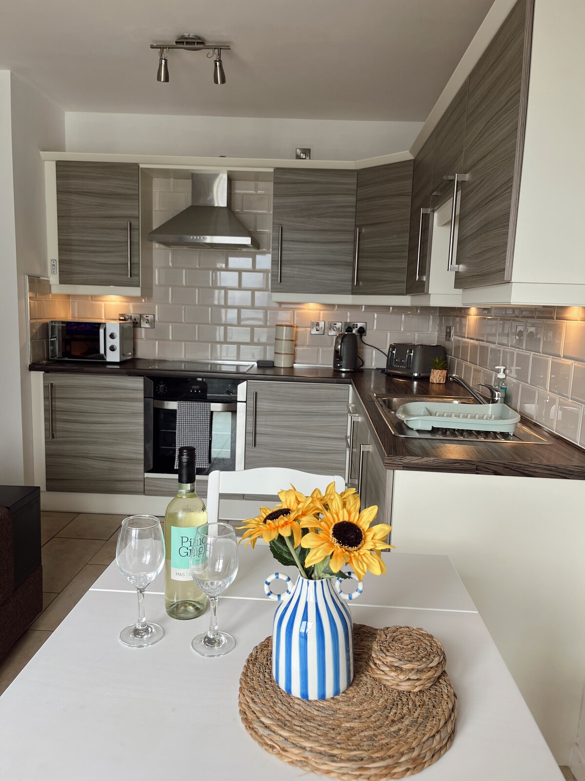 Lyst, romslig hus med tre soverom. Ovenpå er det en stue med TV og gratis kanaler pluss et soverom med eget bad. To ekstra dobbeltsenger nede, samt kjøkken/spisestue, vaskerom og bad. Alle soverom og kjøkken er utstyrt med USB-ladekontakter. Kraftdusjer på begge badene. Parkering utenfor gaten for to biler. Inngjerdet asfaltert område på baksiden og siden av huset med 6 fots gjerde som også inkluderer vaskesnor. Oppbevaringsplass under trappen.