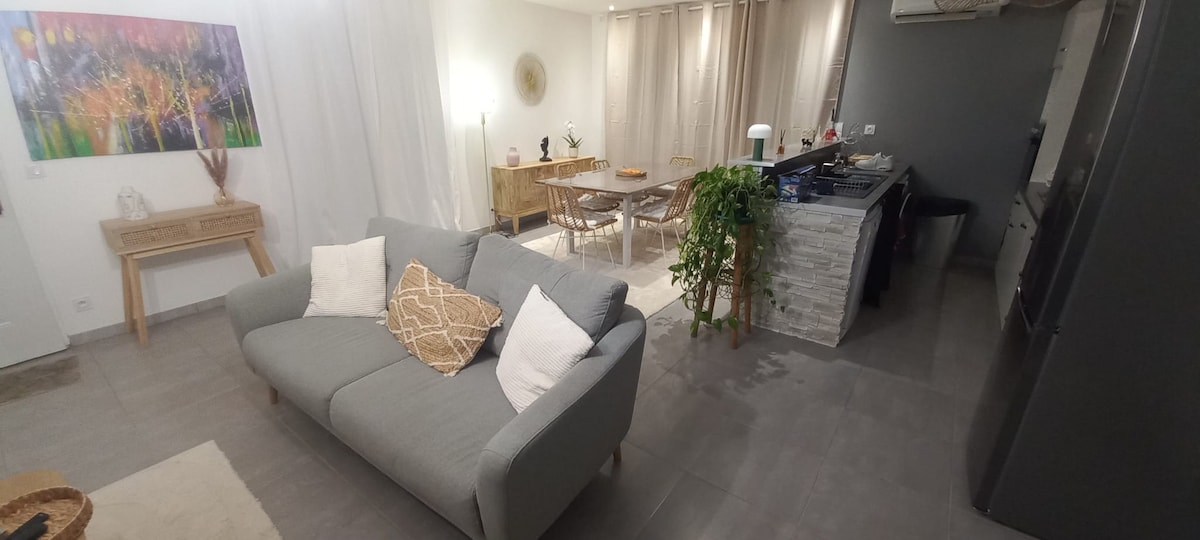 Ligger i Vallon-pont-d'Arc, stille, med fantastisk utsikt. Dette huset med oppvarmet og privat svømmebasseng (åpent fra 31. mars til 1. november) tilbyr deg to vakre soverom, et bad og en veldig stor stue med klimaanlegg med et moderne og utstyrt kjøkken. Til fots finner du alle fasiliteter, og Ardèche ligger noen få meter unna. For din komfort og hvis du er bekymret, er en ladestasjon for type 2 elektrisk kjøretøy tilgjengelig på stedet.