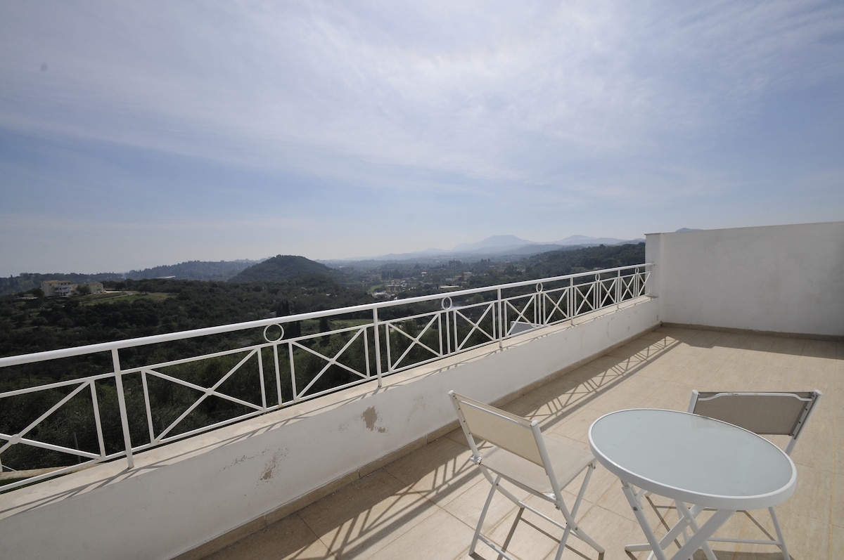 An entire holiday home 10 km just outside the city center to the north of Corfu awaits you to host you and make you spend your most beautiful and relaxing vacation. The renovated areas of the house will offer you comfort and immediate familiarity with the space. The large terrace with the sea view is the ideal place where you can relax on the sun loungers or have your meal at the table.