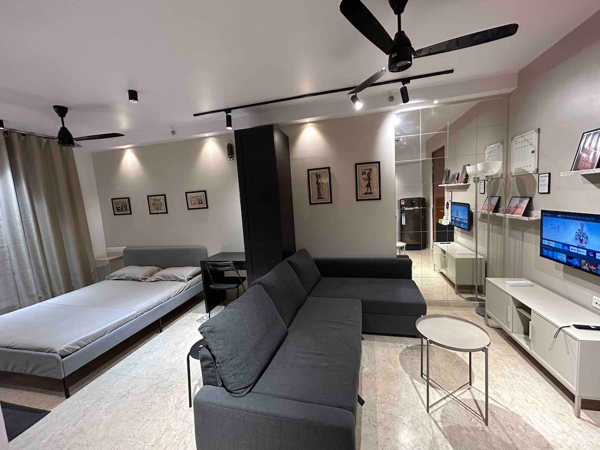 Velkommen til studioet vårt med New York-tema på Hiranandani Estate, Thane – byvibber og elegant design for oppholdet ditt. Nyt en myk seng, sovesofa, smart-TV, trådløst nettverk, fullt utstyrt kjøkken, vaskemaskin og daglig rengjøring. Toalettartikler, dampvaskede håndklær og døgnåpen sikkerhet er inkludert. Bare noen skritt fra kafeer, restauranter og "The Walk". Perfekt for jobbreiser, behandlinger eller en byferie.