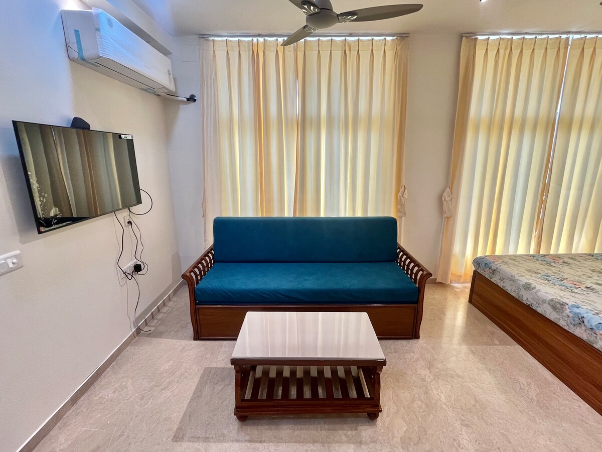 Velkommen til ditt Van Gogh-inspirerte tilfluktssted! Denne stilige 1 BHK-leiligheten ligger sentralt til nær flyplassen og Powai Lake, og tilbyr komfort og bekvemmelighet. Nyt to TV-er, to bad, en spiseplass, IKEA-møbler, spektakulær belysning, gratis trådløst nettverk, Amazon Prime, et Caravaan-musikksystem, klimaanlegg og takvifter. Slapp av på sovesofaen eller den myke sengen på det koselige soverommet. Våkn opp til en fantastisk utsikt over bakken og fordyp deg i en verden av kunst og ro. Bestill nå!