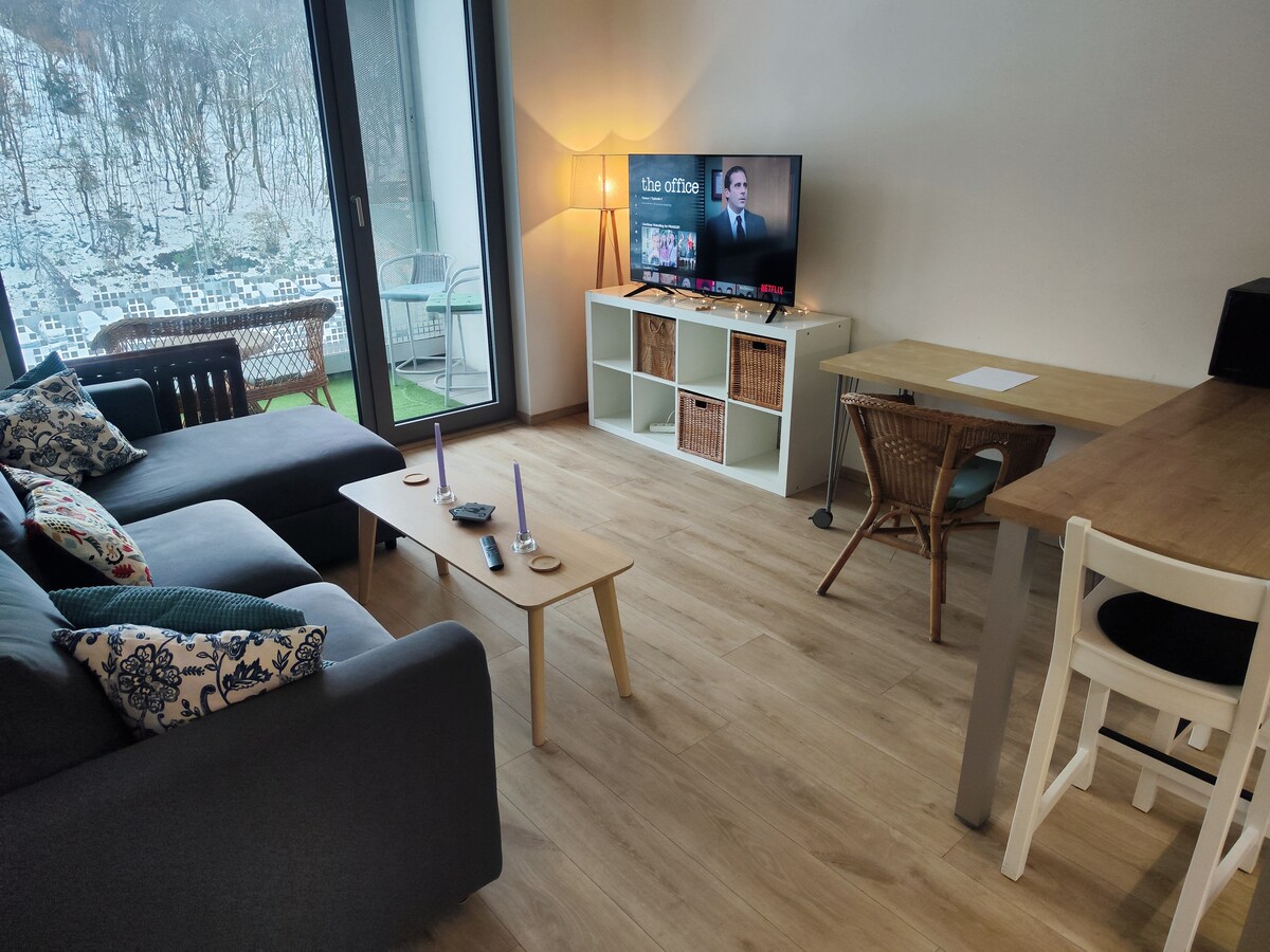 Liten moderne koselig leilighet med balkong og projektor med Netflix. Leiligheten ligger i et rolig nabolag omgitt av vakker natur. Leiligheten ligger ikke i sentrum, reisen til sentrum tar ca. 30 minutter, men transport er lett tilgjengelig (buss, tog, trikk). Takket være dette er området rundt leiligheten helt rolig og ideelt for turer i naturen, det er flere vakre naturlige steder innenfor rekkevidde av leiligheten. Det er en gratis privat parkeringsplass til leiligheten.