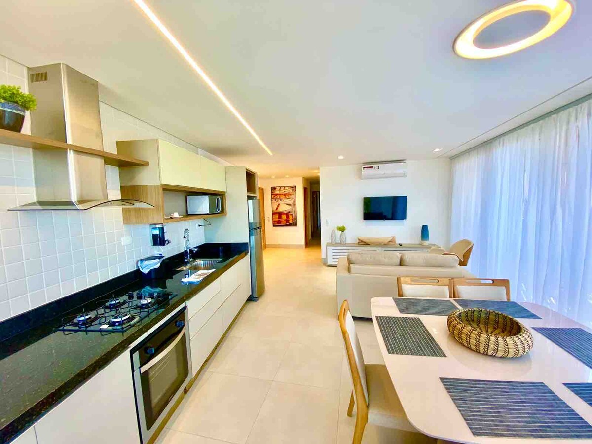 NY leilighet med høy standard og ett minutt fra sjøen. Filmisk dekorasjon og komfort for familien din. Klimaanlegg i alle rom, integrert kjøkken og stue, smart-TV i stuen og soverommene. Det er: 2 soverom, to av dem er suiter (alle med smart-TV) Integrert stue med balkong og kjøkken 1 toalett Komplett kjøkken Gourmetbalkong med elektrisk grill Raskt internett 2 parkeringsplasser Leilighet med fullt fritidsområde, svømmebasseng, badstue, treningsstudio, grillplass og minibaner