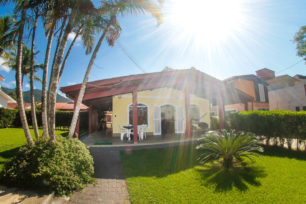** Vi er dyrevennlige! Hus med 3 soverom (1 suite), aircondition, 3 bad, stor og vakker hage, fullt utstyrt kjøkken, svømmebasseng, 300MB fiber wi-fi, grill og VEDOVN! Plass til 10 personer. Garage for 3 biler. Huset er lyst, moderne og smakfullt. Det ligger i en rolig gate i et boligområde med vakt, med mulighet til å gå inn gjennom porten til Samola-leilighetskomplekset. Huset ligger på den vakre Lagoinha-stranden i Ubatuba, bare 8 minutter å gå til stranden (500 m).