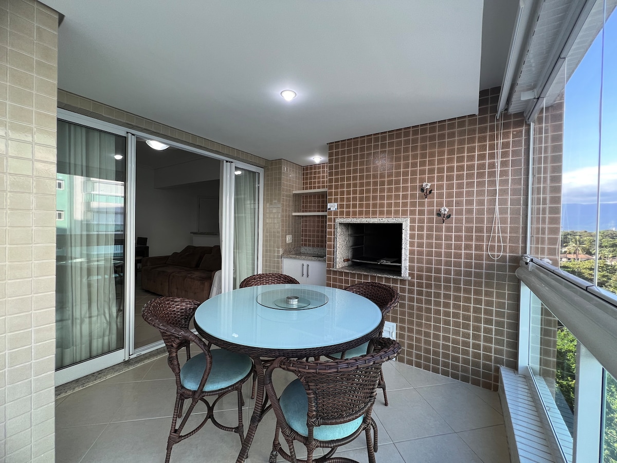 Apartamento aconchegante com linda vista para as montanhas e cachoeira . Condominio pé na areia! Confortável e espaçoso conta com uma varanda gourmet com churrasqueira, muito agradável e sossegada. Uma vaga de garagem dentro do condomínio. Estamos bem em frente a uma praia linda e limpa. Desfrute de finais de semana tranquilos e agradáveis . Ao lado da Riviera. Ar condicionado nos quartos e wi-fi 600 MG ! Condominio completo .Academia, piscina , sauna e muito mais!