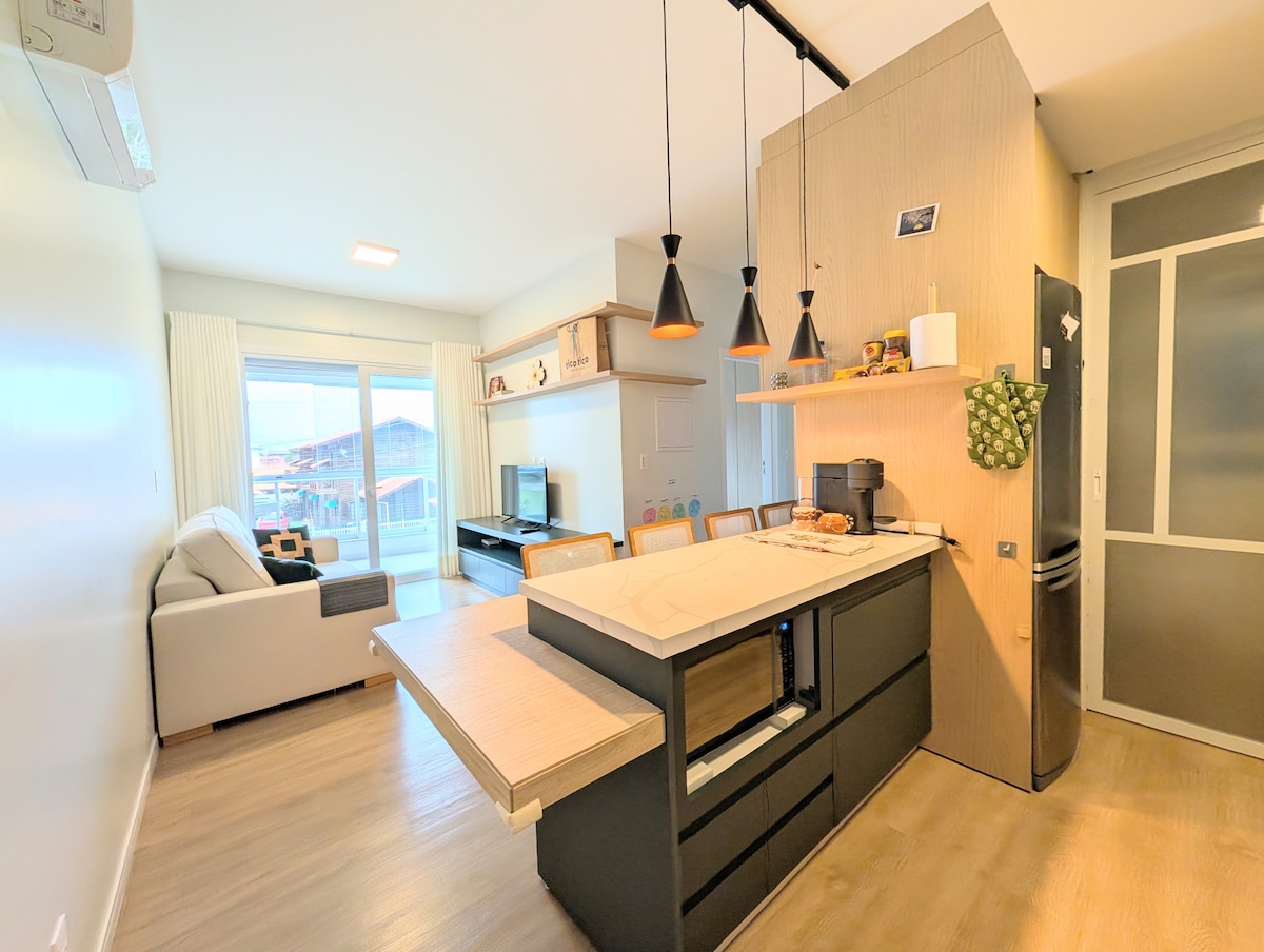 New, clean and comfortable studio, with air conditioning and just 30 meters from the beach. It is located between the beaches of Campeche and Morro das Pedras. The Studio has a 32-inch Smart TV, 200Mb Wi-Fi, a full kitchen - fridge, freezer, stove, gas oven, microwave oven, electric oven and coffee maker. The living room is integrated and the very comfortable sofa bed can accommodate a third guest. The beach is quiet, ideal for surfing, diving, kitesurfing or just relaxing by the shore.