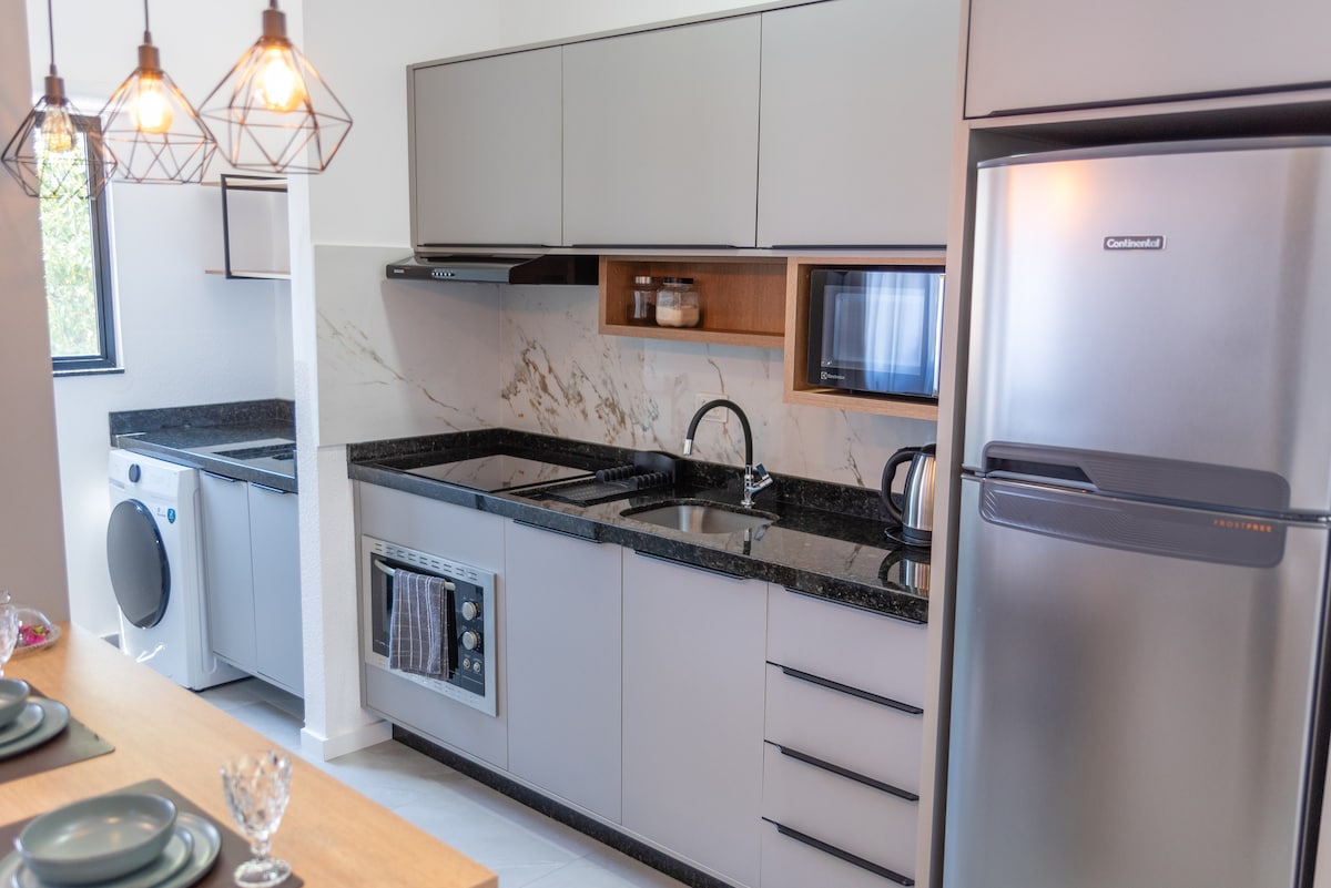 Nytt studio! Arkitektonisk design med komfortabelt og funksjonelt design. Stabilt og kraftig internett, perfekt for å jobbe og ha det gøy på samme sted, 400 meter fra sjøen. Tilpassede møbler, nye apparater, designet for økonomi og praktiskhet, klimaanlegg, varmt vann i alle kraner, vaskemaskin, 43-tommers TV, Dolce Gusto kaffemaskin, ClaroTV, Disney og Netflix. Familiebygning, rolig, med basseng og garasje. Finn det perfekte oppholdet i Florianopolis, enten du er på fritids- eller jobbreise.