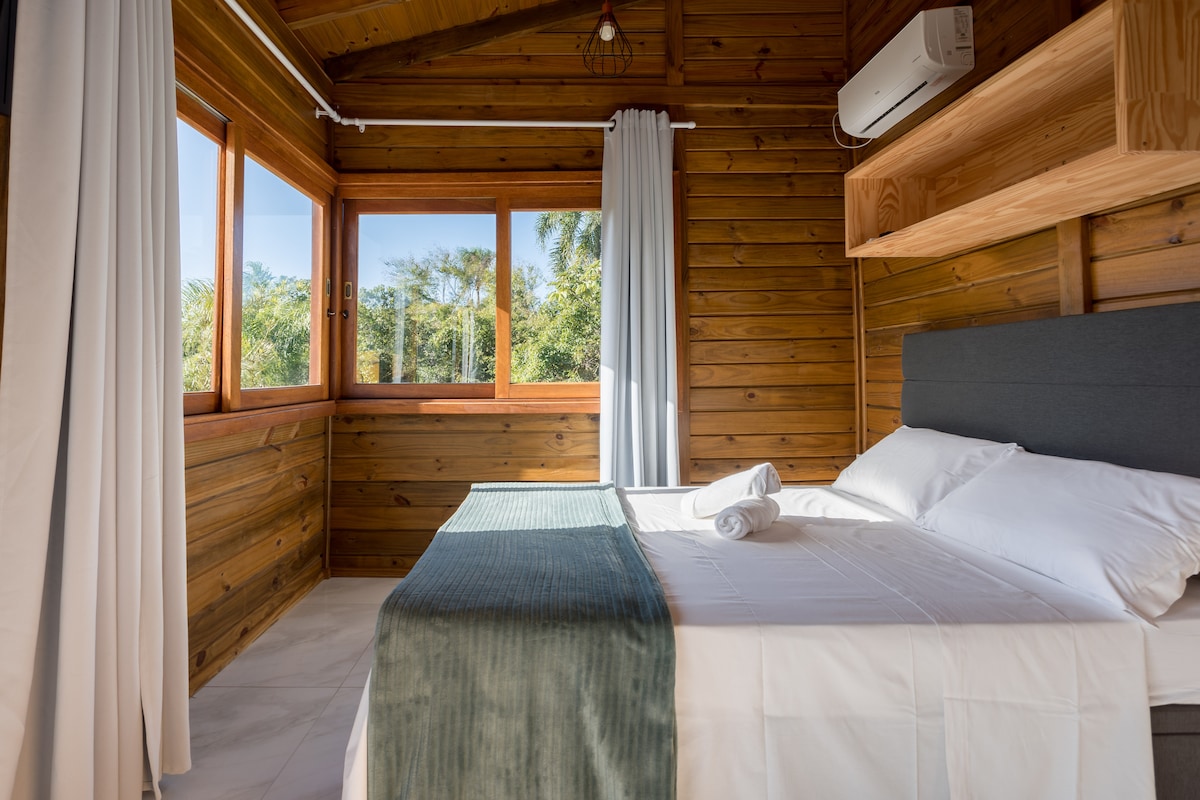 🌿 Hytte 1 på Koru Cabanas er et fredelig tilfluktssted omgitt av grønne områder, og tilbyr mer privatliv for oppholdet ditt. 🌻 Eiendommen har tre hytter, en hage med en dam og et felles grillområde. 🏡 Stedet har plass til opptil tre personer (soverom med dobbeltseng + sovesofa), har et komplett kjøkken, trådløst nettverk, aircondition og én parkeringsplass. 📍Vi ligger 600 meter fra sentrum og 1,2 km fra Praia do Rosa.