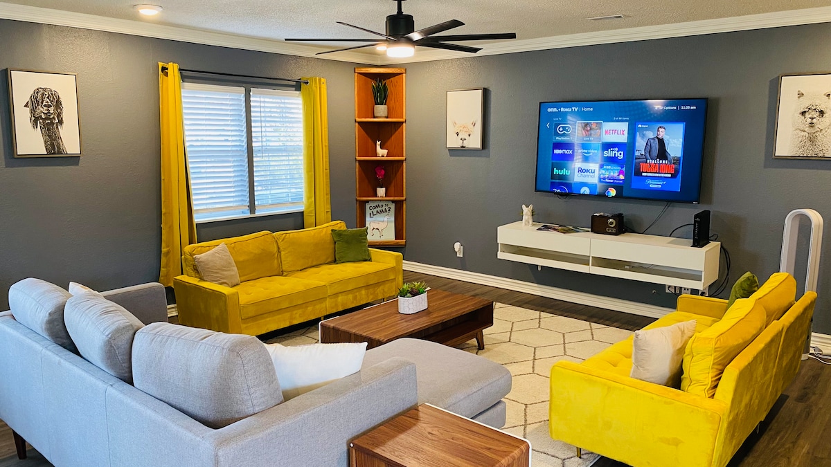 Moderne privat hjem kun fem minutter fra sentrum i Rogers. Denne nydelige 4-sengs 2-bad har plass til 9 personer. Futonen og sofaene har plass til én. Rask tilgang til I-49 til Bentonville eller Fayetteville. Helt nye apparater, møbler, fire queensize-senger, høyhastighets internett, Roku-TV-er på alle rommene. Kaffekanne, Keurig-kaffe, vann og snacks er tilgjengelig. Luksuriøst dusjpanel i feriestedstil med massasjestråler for å vaske bort alt stresset! Stor bakgård med bålplass og grill.