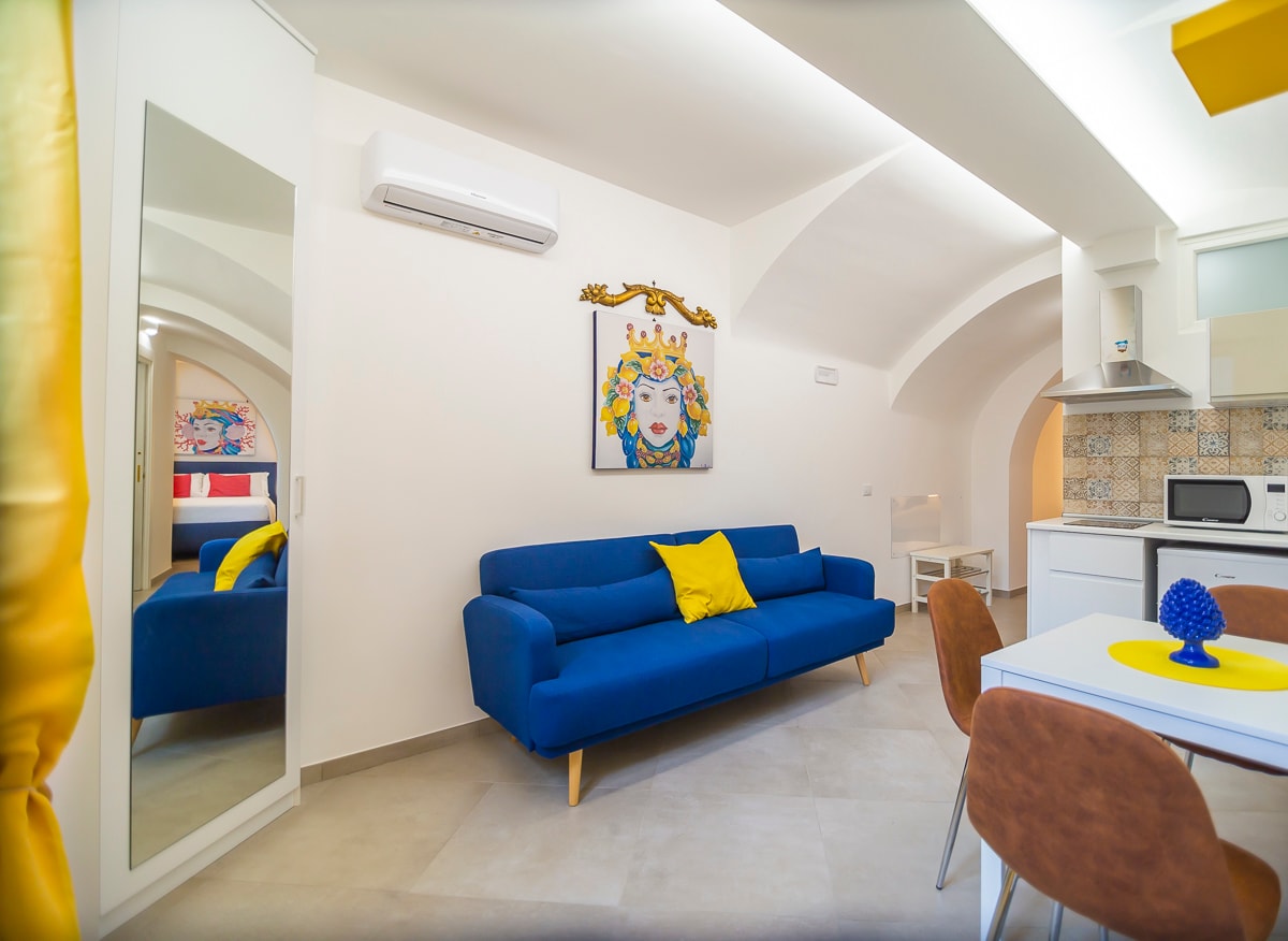 Den vakre leiligheten ble totalrenovert i 2021. Leiligheten ligger i andre etasje i en gammel bygning uten heis. Leiligheten er smakfullt møblert i middelhavsstil, og inkluderer en dobbeltseng, sitteplass, fullt utstyrt kjøkken, marmorbord og fire stoler, stor garderobe, én TV, og den er utstyrt med alle bekvemmeligheter og tjenester, oppvarming og klimaanlegg, trådløst internett. Leiligheten har utsikt over havet med fantastisk utsikt over Sorrento-halvøya.