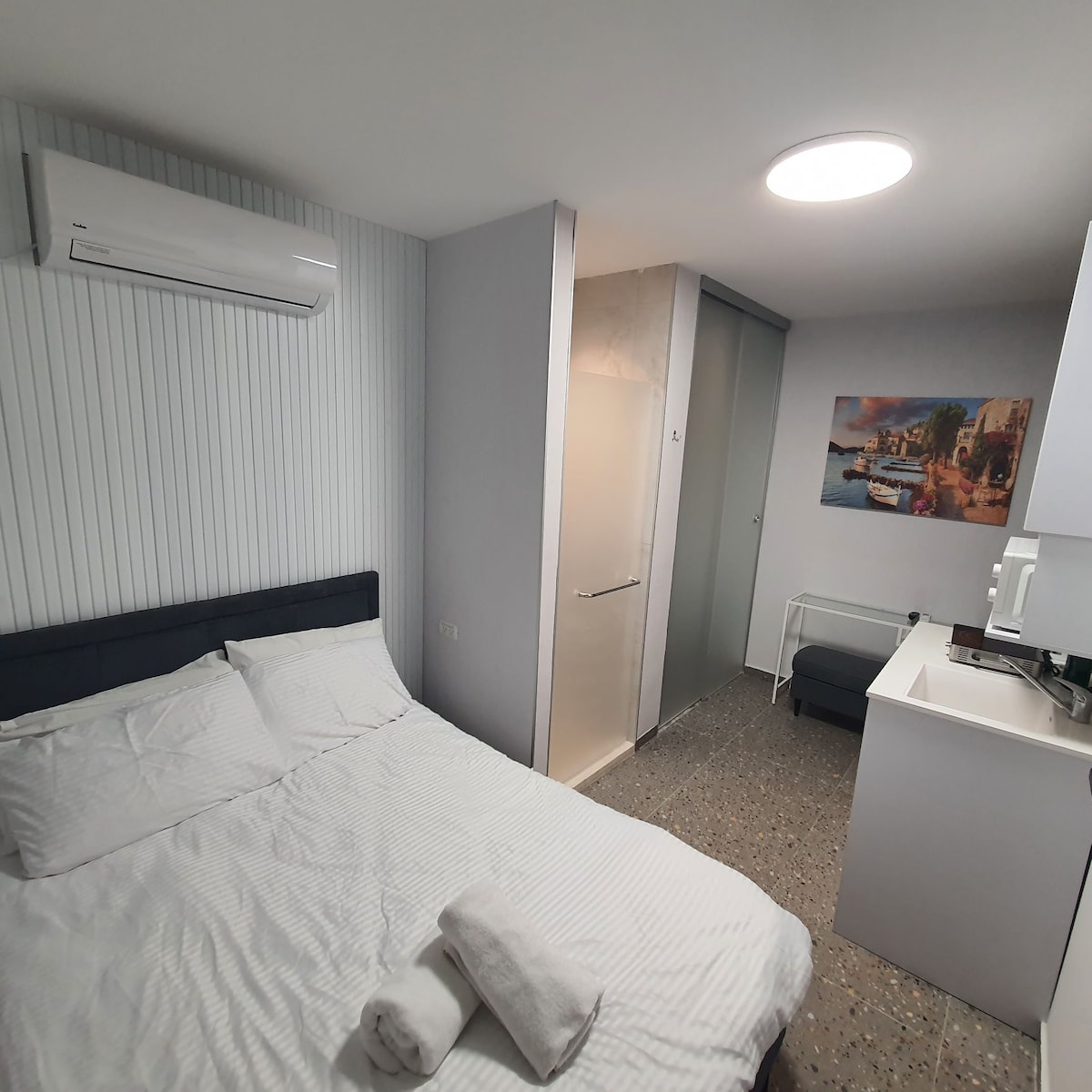 Stilig suite i nærheten av New Bat Yam Beach! Nyrenovert suite i det beste området i Bat Yam, i nærheten av den romslige nye stranden. Moderne design, maksimal komfort og helt nytt utstyr! ✔ Koselig soverom med to vinduer. ✔ Stue med 55" Samsung smart-TV og internasjonale kanaler ✔ Kjøkken med induksjonstopp, stekeovn, kaffemaskin, mikrobølgeovn, kjøleskap, vannkoker og brødrister. ✔ Tre klimaanlegg, dusj, vaskemaskin og tørketrommel ✔ Heis, fibernett, enkel kollektivtransport Perfekt for ferie eller jobb!