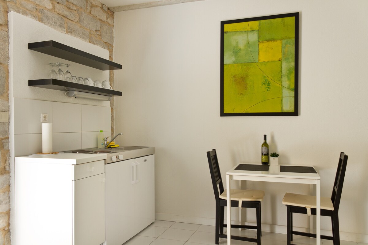Romslig og luftig ettromsleilighet for opptil tre gjester. Plassert i vårt vakre familiehus i stein. Ideelt for par, venner og familie. Leiligheten har ett stort soverom, et stort privat kjøkken og bad og et privat uteområde med bord og stoler rett utenfor leiligheten. Utstyrt med aircondition og gratis trådløst nettverk. Du har også en unik mulighet til å nyte vakker utsikt fra hovedterrassen vår.