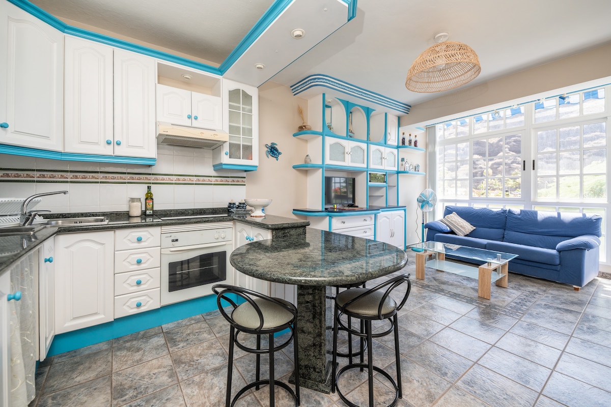Leiligheten vår er 80 kvadratmeter stor, inkludert den skjermede solterrassen med utsikt over Atlanterhavet. En stor stue, SALÓN, er utstyrt med møbler av høy kvalitet. På den romslige sofaen kan du nyte utsikten over Atlanteren gjennom de store skyvedørene i glass, og spisebordet i eik gir god plass til opptil seks personer. Huset ligger alene mellom fiskehavnen, marinaen og byen Tazacorte Puerto.