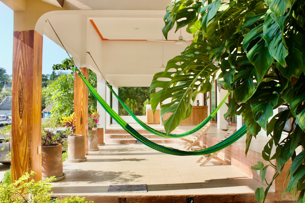 @casanayapuerto — hvor design møter havet. Prisen din inkluderer et komplett personale: daglig frokost, renholdsarbeidere og en dedikert husleder for å sikre at alt flyter med letthet. Bare syv minutters spasertur til stranden og en rask fire minutters drosjetur til La Punta . Vi tilbyr det beste av begge verdener — ro og kontakt. Nyt et privat saltvannsbasseng, klimaanlegg på soverommet og eget soverom med fantastisk havutsikt. Et sted å slappe av og føle deg inspirert i hjertet av Puerto Escondido
