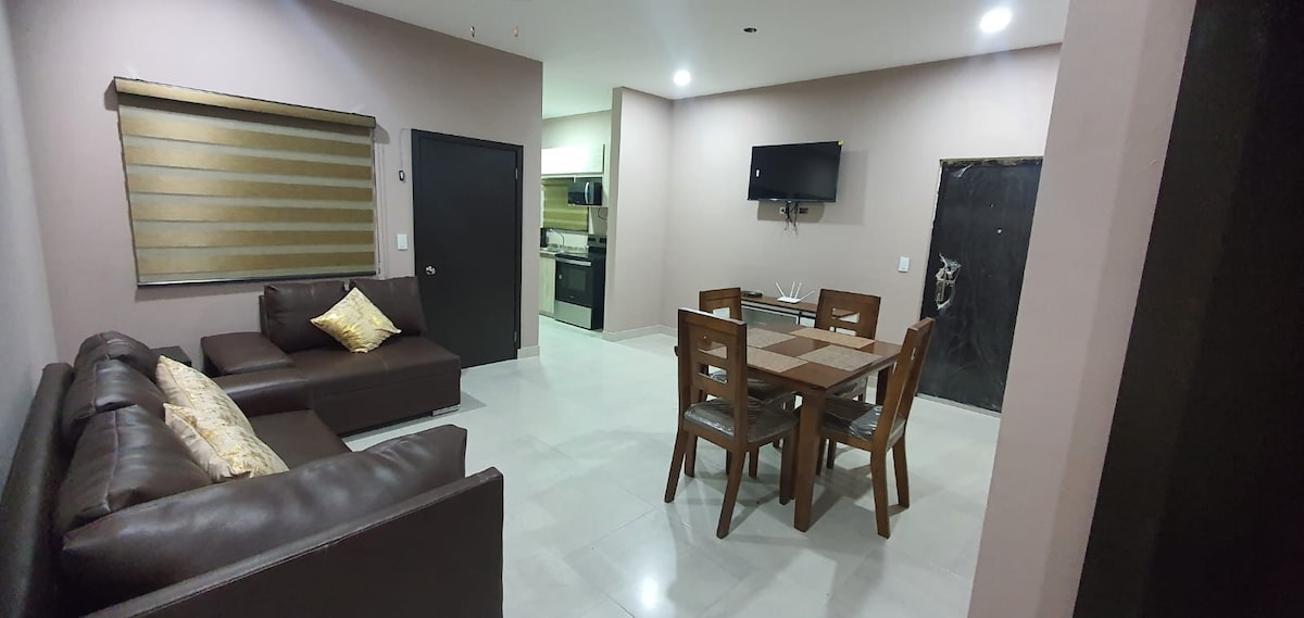 "Vakker leilighet 5 minutter fra strandpromenaden, El Mirador-stranden, to kvartaler fra Benito Juárez Main Boulevard og ett kvartal fra fremont boulevard i nærheten av supermarkeder, trådløst nettverk, kabel, privat parkering for én bil, utstyrt kjøkken. Vi implementerer de høyeste standardene for renhold og hygiene for din sikkerhet og komfort.