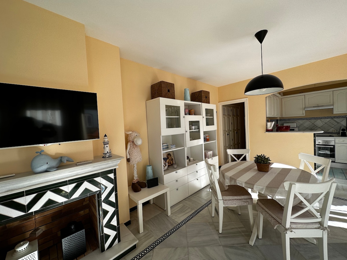 Maravilloso apartamento, junto al Parque Natural de los Turuños, en el centro de la Bahía de Cádiz, consta de un dormitorio con cama de 150 y un sofá cama, baño completo y cocina independiente, en urb. de lujo, playa a 100m. Hemos aumentado nuestras estrictas medidas de limpieza y desinfección. Piscina abierta desde el 20 de junio al 18 de septiembre. No se admiten mascota.