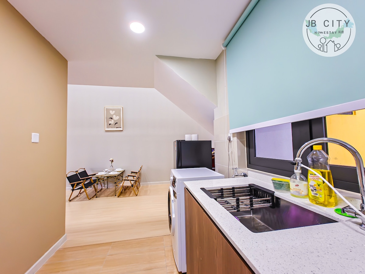 Vårt minimalistiske hjem er din ideelle, rolige himmel. Unnslipp det daglige kjas og mas, og fordyp deg i den rolige, koselige komforten. Den vakre høyetasjen med havutsikt og den flotte beliggenheten passer for par og hele familien som søker en tur. Bare fem minutter unna Sg. 3–5 minutters gange til Familymart, Starbucks, restaurant, kino, Sunway Big Box Retail Park, X Park osv. 8 minutter med bil til Legoland. Slapp av sammen med hele familien på dette fredelige bostedet.