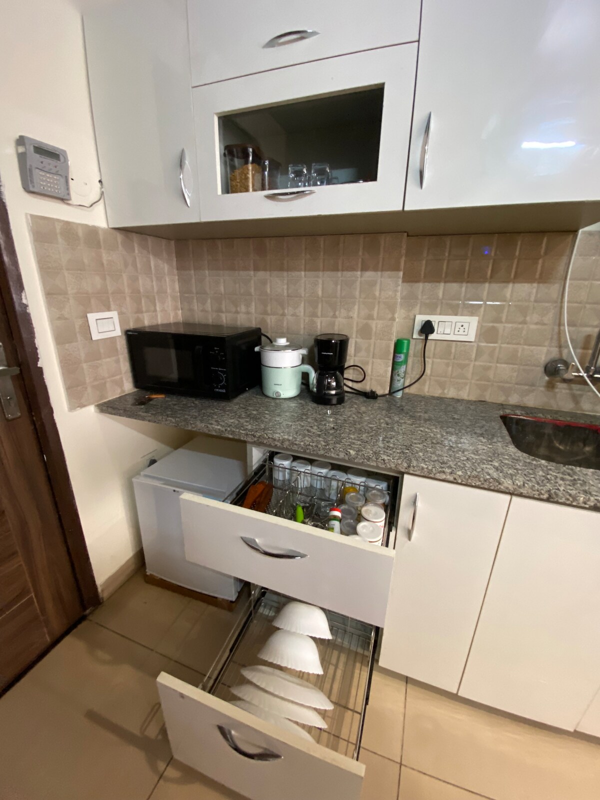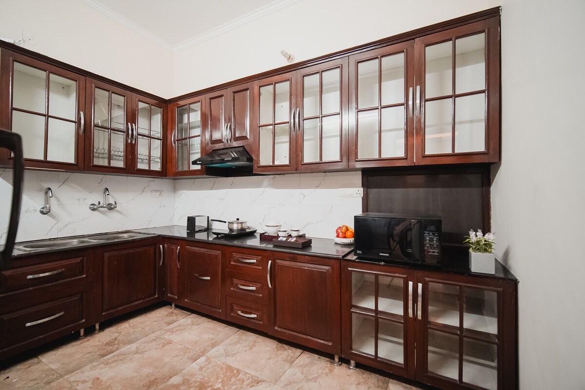 3 people sleep in this apartment, 2 on Main Bedroom and 1 on Sofa cum bed in entry Room. Good family or group friends stay in the city center of Chandigarh, VIP Road Zirakpur, Next to Panchkula Border, Just 10 mins drive from GMCH Hospital 32, 20 mins from Chandigarh’s PGI and Sector 16 Hospital. All cooking appliances with Induction. Cosmo Mall is just 5 mins walk away. Couple & Family friendly private 1BHK apartment with best RO water filter, most Expensive WakeFit Bodysence 10 Inch Mattress.