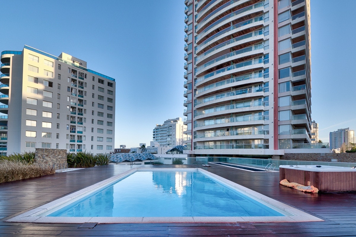 Punta del Este, splitter ny leilighet, mye naturlig lys i alle rom. Bygningen ligger veldig bra til, med utmerkede tjenester; oppvarmet basseng, utendørs basseng, treningsstudio, grill, fotballbane med syntetisk gress, mikrokino, rom for barn, ungdom og voksne, egen lukket garasje, døgnåpen resepsjon, vaskeri, osv. wifi. strykejern, hårføner. Fullt utstyrt for 4 personer, sengetøy og håndklær, luft, 2 smart-TV 40"
