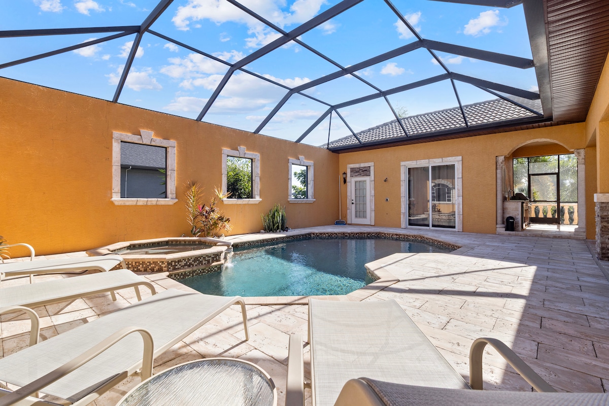Stuen har en 65" smart-TV, veggmontert med en LCD-peis under med surroundlyd. Alle TV-er har Netflix. Barrommet har et lite kjøleskap, biljardbord og dartbrett. Ute har en privat lanai med oppvarmet basseng og en propanbålpanne. Nyt sonos-lyden med 55" smart-TV i hovedsoverommet. Det andre soverommet har også en TV. Barrommet har også Sonos, i likhet med verandaen. 30 minutter fra flere strender. Garasjen er ikke tilgjengelig. Hjemmet ligger i en rolig blindvei.