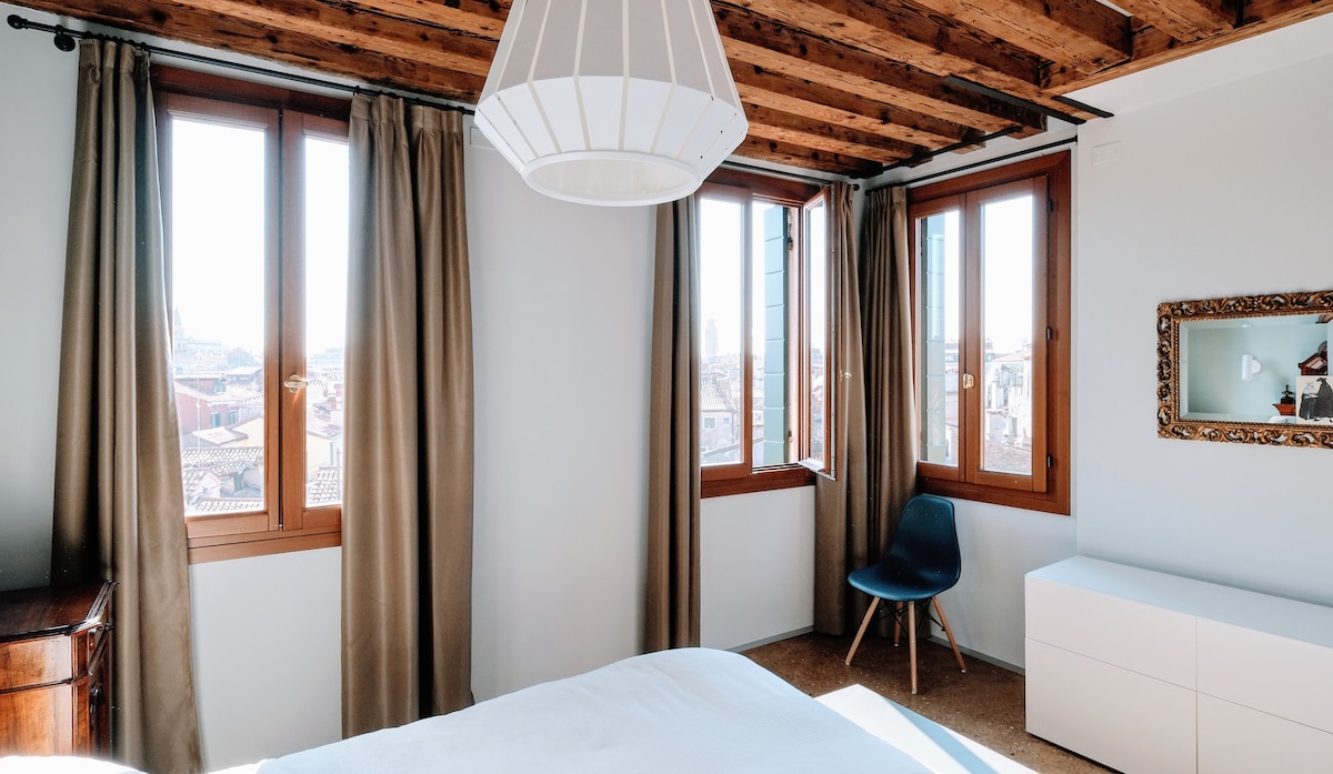 Velg en bok fra en hylle og synk ned i en rød lenestol under et spistaket. Slående tømmerbjelker og skinnende tregulv gir varme og karakter til dette ombygde loftsrommet. En innbydende spiraltrapp fører til en liten avsats med utsikt. Leiligheten har en elegant inngangshall med stort dobbeltvindu med utsikt over den nærliggende kanalen. I øverste etasje: stue med fullt utstyrt kjøkkenkrok av topp kvalitet, ett hovedsoverom med imponerende utsikt over Madonna dell' Orto-kirken, et ekstra dobbelt-/twin-rom, ett romslig bad med toalett/bidet/badekar/dusj, et ekstra toalett med servant. En dekorativ spiraltrapp fører fra stuen til en liten takbalkong med utsikt mot den pittoreske kanalen foran huset. Leiligheten er utstyrt med god WIFI-TILKOBLING, KLIMAANLEGG og MYGGNETT i alle rom. CASA ZORZI anbefales både for romantiske ferier og for familieferier. Jeg pleier å ønske gjestene mine velkommen personlig, og bruke litt tid ved ankomst til å anbefale favorittstedene mine i byen. Leiligheten er også utstyrt med gode referansebøker som er nyttige for å planlegge og nyte et opphold i Venezia. Leiligheten ligger på den roligere siden av det virkelig venetianske Cannaregio-distriktet. Huset ligger ved siden av den praktfulle Madonna dell' Orto-gotiske kirken, som inneholder verdifulle skatter, inkludert Tintoretto-mesterverk. Det ligger 15 minutter fra Rialtobroen. Det er veldig enkelt og komfortabelt å nå med offentlig transport, enten du kommer fra Marco Polo flyplass eller fra togstasjonen, uten noen bro å krysse med bagasjen din mellom nærmeste vannbussholdeplass og leiligheten. En byoppholdsskatt på € 4,00 per dag per person (€ 2,00 for 10/16 barn, unntatt barn opptil 10) forfaller opptil maks 5 dager.