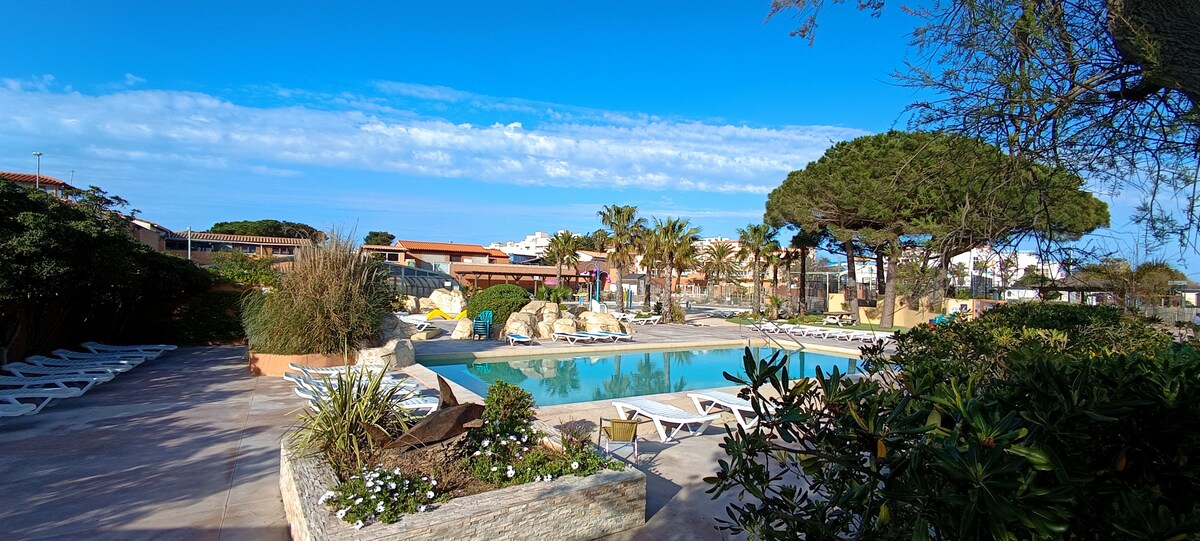 Denne campingplassen av høy kvalitet er ideelt plassert (strand, dam, butikker, thalassosenter) og har bakeri, dagligvarebutikk, restauranter, frisør, lege. Utsikt over dammen med rosa flamingoer og på fjellet Canigou, 30 minutter fra Spania, 10 minutter fra jernbanestasjonen, fra flyplassen i Perpignan. Mange aktiviteter, barneklubb 1-15 år. Den har sitt eget badeland med oppvarmet innendørs svømmebasseng, sklier, plaskebasseng, SPA, splash, petanquebaner, bordtennis, treningsrom, lekeplasser.