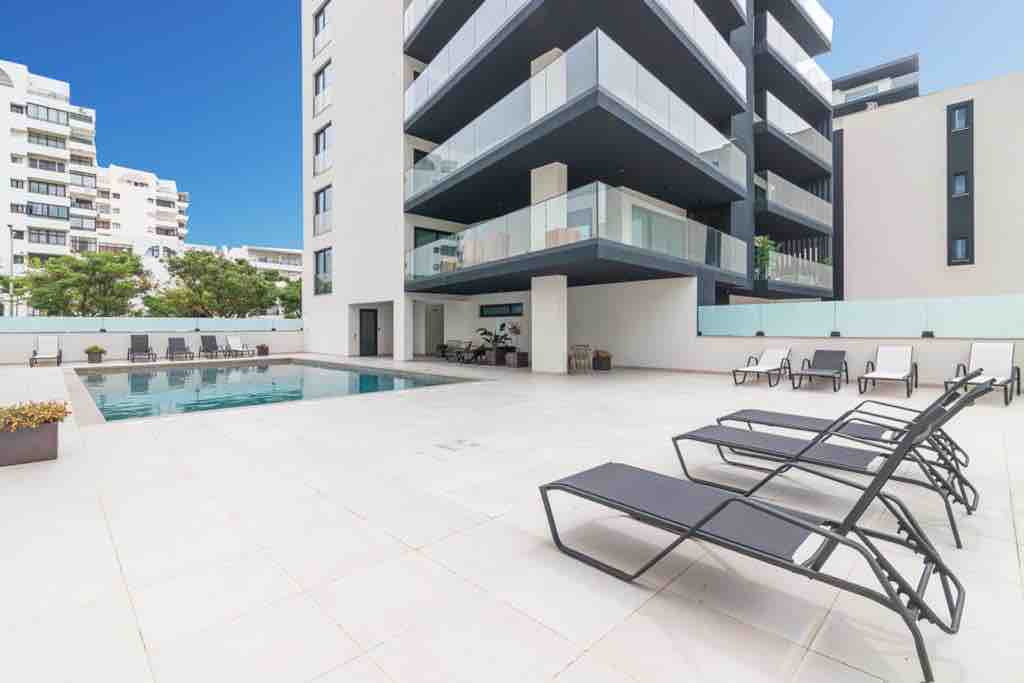 70 meter fra stranden: moderne leilighet med basseng og klimaanlegg