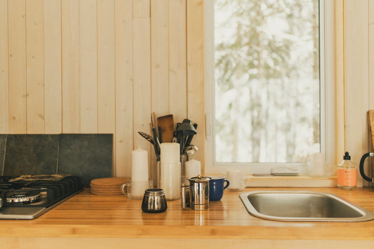Velkommen til La Khabine! Denne koselige, moderne hytta har alt du trenger for å slappe av og få kontakt med naturen. Nyt et glass vin med lyden av en knitrende flamme i peisen. Nyt utsikten over skogen gjennom de omkringliggende vinduene fra gulv til tak. Slapp av i den private utendørs badstuen laget av sedertønner. Naturlige selvpleieprodukter, ved, vaskemiddel og raskt trådløst nettverk er inkludert. Vi håper du kommer til å elske den lille hytta vår med vinduer like mye som vi gjør :)