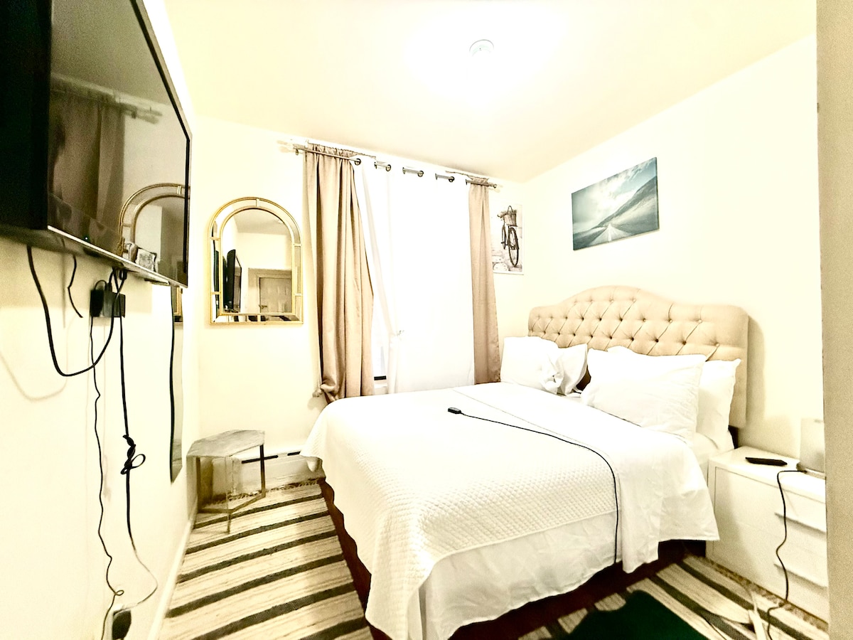 Denne leiligheten er komfortabel, romslig og godt opplyst, få skritt fra restauranter og supermarkeder. Det er en 20-minutters busstur fra Manhattan i New York. Bussen stopper rett foran leiligheten. Busstjenesten går døgnet rundt. Soverom med to queensize-senger, to nattbord, to lamper, en 50-tommers smart-TV, en kommode, et walk-in-garderobe, en sovesofa og en Stuen har en 60-tommers smart-TV, et skrivebord og klimaanlegg. Kjøkkenet Den moderne spiseplassen har fire stoler og et fint bad.