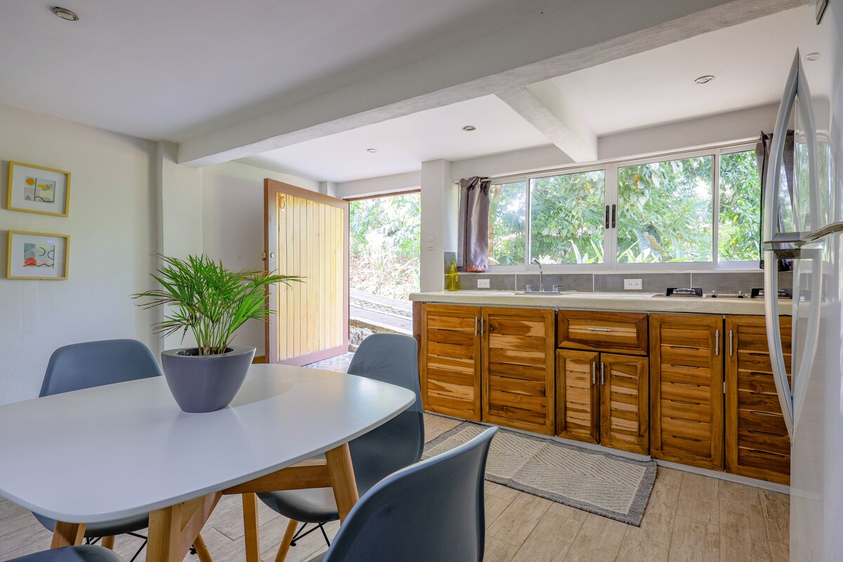 Den stilige studioleiligheten vår ligger i hjertet av Dominical! Med et fullt utstyrt kjøkken, queensize-seng, sovesofa og et unikt lavere tak på kjøkkenet, er det et perfekt sted for et par, soloreisende eller en liten familie å nyte hva Dominical har å tilby! Det er fem minutters gange til stranden og et trygt og komfortabelt sted å tilbringe ferien din! Kom og surf på Dominicals høypresterende bølger, nyt de vakre strendene våre, ta del i de mange eventyraktivitetene vi tilbyr, eller bare slapp av!