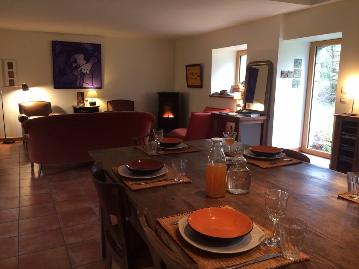 I en gård fra det 18. århundre, med havet innenfor vingeslag (4 km), en fin hytte, praktisk og poetisk, på stedet for en liten gård i agroøkologi (fruktsaft, blomster). 3 dobbeltrom, 3 tilstøtende bad, en stor stue, vedvarme, en hage på sørsiden, rolig, på landet. Wi-Fi er tilgjengelig.