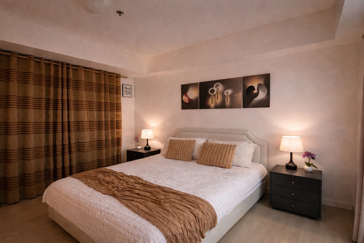 En fullt møblert, Ig-verdig, koselig og stilig 34 kvm, 2-roms leilighet med en fantastisk balkong hvor du kan slappe av, feire viktige hendelser eller bare ha en rask ferie med familie eller venner og nyte unike fasiliteter i verdensklasse som bølgebassenget, kunstig hvit strand, lekeplass, basketballbane, treningsstudio, volleyballbane, strandbar, himmelhage og mye mer. Det ligger bare fem minutters gange fra et kjøpesenter (SM Bicutan) og bare 10–15 minutter fra NAIA flyplass.