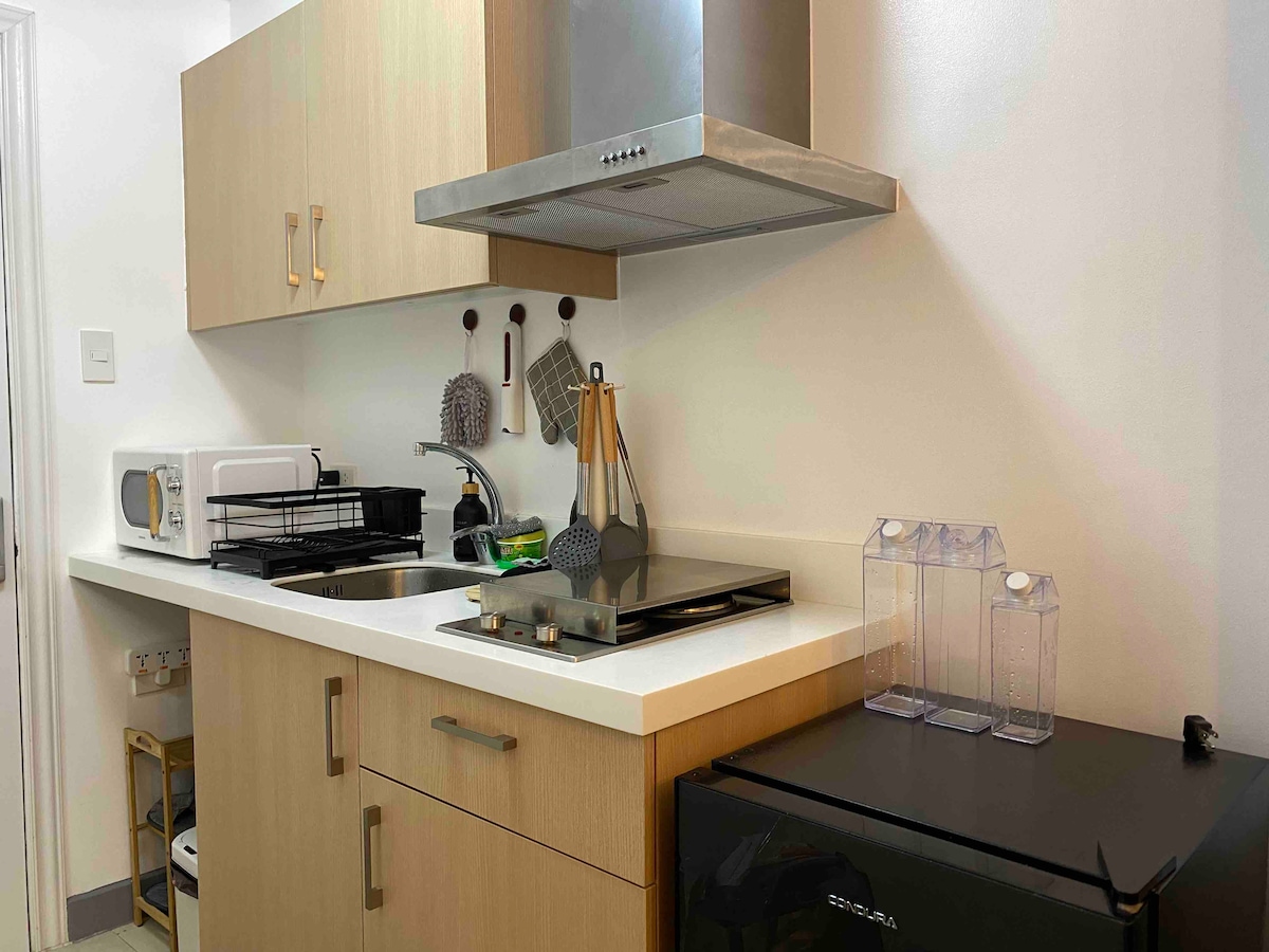 Velkommen til ditt andre hjem! Vi bor for tiden i Canada, så vi leier ut den fullt møblerte 25 kvadratmeter store studioleiligheten vår, som ligger i sentrum av Commonwealth og Batasan Hills. Den er ideell for to voksne og ett barn, med en queensize-seng og en koselig toseters sofa i stuen. Kjøkkenet er fullt utstyrt med kjøkken- og spisestueutstyr for enkelhets skyld, og badet har gratis toalettartikler. Gjestene har også gratis tilgang til fasilitetene i leiligheten. ♡