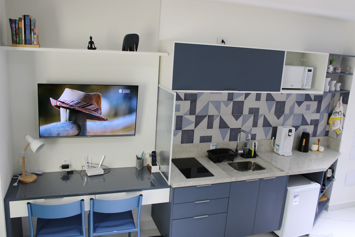 Nyt praktiskheten og roen på dette koselige og godt beliggende stedet. Studio novissímo i Tatuapé, ved siden av Carrão T-banestasjonen. Interne overnattingssteder – Utstyrt kjøkken (mikrobølgeovn, kaffetrakter, vannfilter med tre temperaturer, kjøkkenutstyr) - Queen size-seng - Håndklær og sengetøy - Bad (godt trykk på varmt/kaldt vann) – Smart-TV og åpent signal - Raskt trådløst nettverk – vifte Eksterne fasiliteter - Gym - Felles kontorplass – OMO fellesvaskeri – Ingen gratis parkering