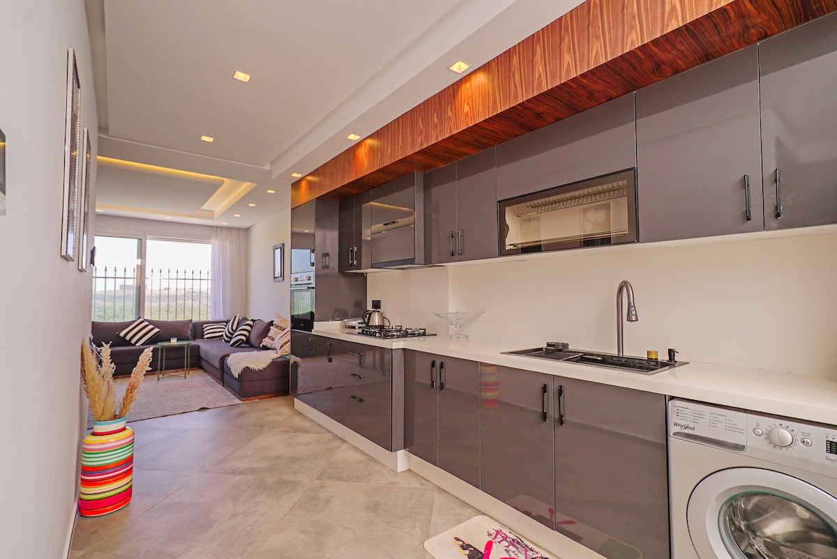 Velkommen til Mehdia Beach! Nyt et avslappende opphold i den vakre leiligheten vår, som ligger bare en kort spasertur fra sjøen. Stedet tilbyr: Et soverom med en komfortabel dobbeltseng Bad med dusj Fullt utstyrt og utstyrt kjøkken. En komfortabel stue med store sofaer. En møblert terrasse med bord, stoler og en huske for unike øyeblikk av avslapning. Fasiliteter inkludert: Nespresso-kaffemaskin Høyhastighets fiberoptisk trådløst nettverk To smart-TV-er (50" og 43").