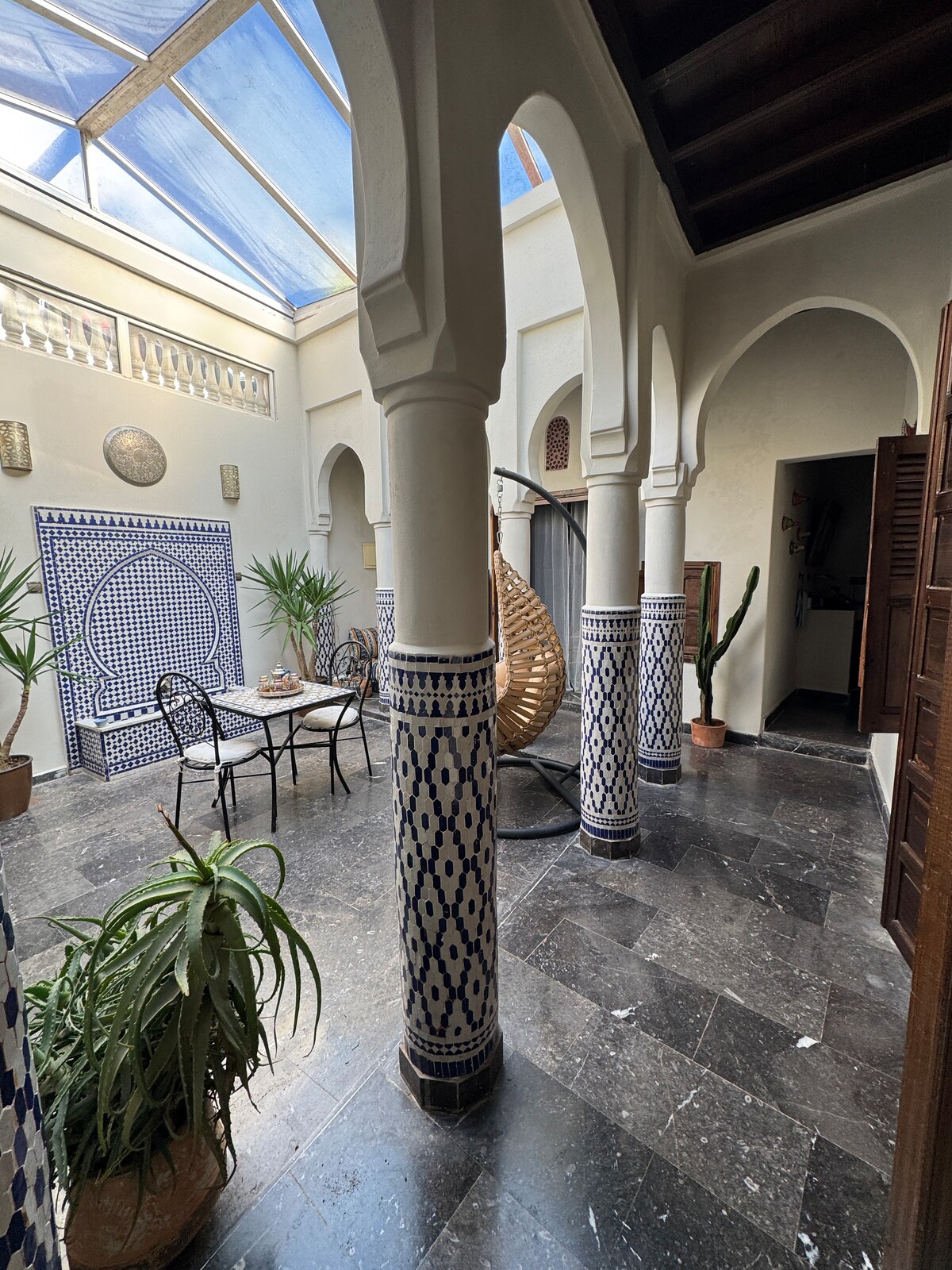 Riaden vår har tradisjonell marokkansk design og ligger i hjertet av Medinaen i Rabat. Hvis du vil oppleve Medina-atmosfæren, kan du nyte den her. Dessuten kan du utforske vintageartikler som en gasskomfyr eller platespiller... som vil bringe deg tilbake til gamle minner. Selv om denne enkelheten kanskje ikke passer alle som er vant til det moderne livet, vil de som setter pris på lokale tradisjoner elske det. Vi har beholdt det meste av de tradisjonelle designene og redskapene som en måte å hedre marokkanske tradisjoner på.