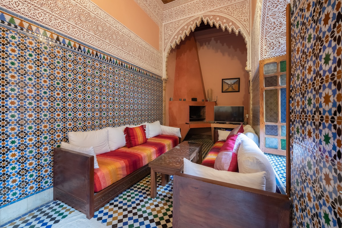 Nyt turen til Meknes i denne hele etasjen i en tradisjonell marokkansk kunstnerisk riad som komfortabelt har plass til 11 gjester. Den har tre soverom, tre bad og et kjøkken. Riad ligger bare 5 minutters gange fra Bab Lakhmis-porten, inngangen til den gamle Medinaen. Hvis du ankommer med bil, kan du ha ro i sinnet med GRATIS parkering, sikker overvåking og en nattvakt!