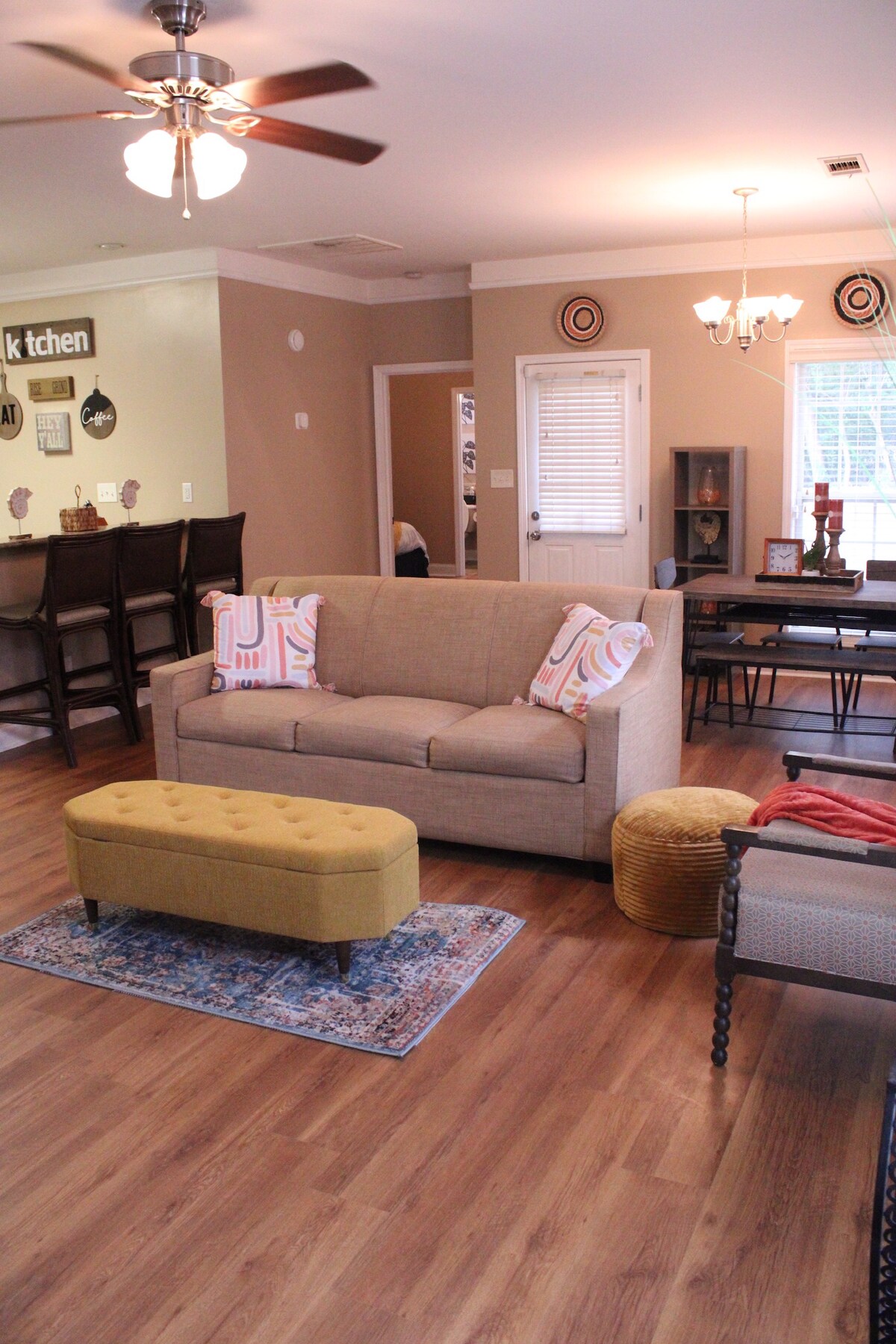 Nyrenovert i 2022! Med to soverom og to fullstendige bad er det god plass til en familie på fire personer. I tillegg har den alle fasiliteter som er nødvendige for å være en hyggelig langtidsutleie. RØYKING FORBUDT! Beliggende mindre enn to miles til Gunter AFB og syv miles til Maxwell AFB, er det det perfekte stedet for militære familier på TDY. Publix, CVS apotek, restauranter og bensinstasjoner ligger innenfor tre kvartaler. Det er også bare ti minutters kjøring til det historiske sentrum i Montgomery!