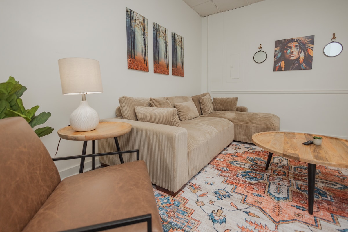 Vår moderne studio ligger på Town Run og noen skritt unna sentrum av Shepherdstown. Enten du er her for en avslappende flukt eller et universitetsbesøk, kan du lytte til en foss fra vårt koselige, zen, spa-lignende rom med utendørs hager. Det er en oase med en komfortabel seng, dedikert arbeidsområde og dusj. Den ligger i det historiske sentrum, og du kan enkelt utforske German St., med en rekke spisesteder, shopping og utendørsaktiviteter en kort spasertur fra Potomac-elven og C&O-slepebanen.