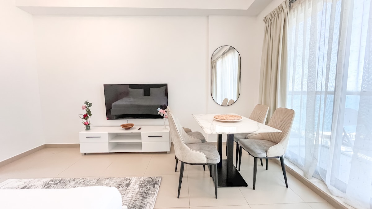 Slapp av i denne elegante studioleiligheten ved den skandinaviske kysten, hvor beroligende blåtoner, en ny massasjestol for hele kroppen, havinspirert innredning og naturlige teksturer skaper et rolig tilfluktssted. Denne moderne studioleiligheten har en perfekt beliggenhet på Al Marjan-øya i nærheten av den kommende Wynn Resort, og den tilbyr smarte fasiliteter, en sjarmerende balkong med delvis havutsikt for å nyte havbrisen og eksklusiv privat tilgang til stranden. Svøm, sol deg eller utforsk nærliggende kaféer og restauranter for et minneverdig opphold.
