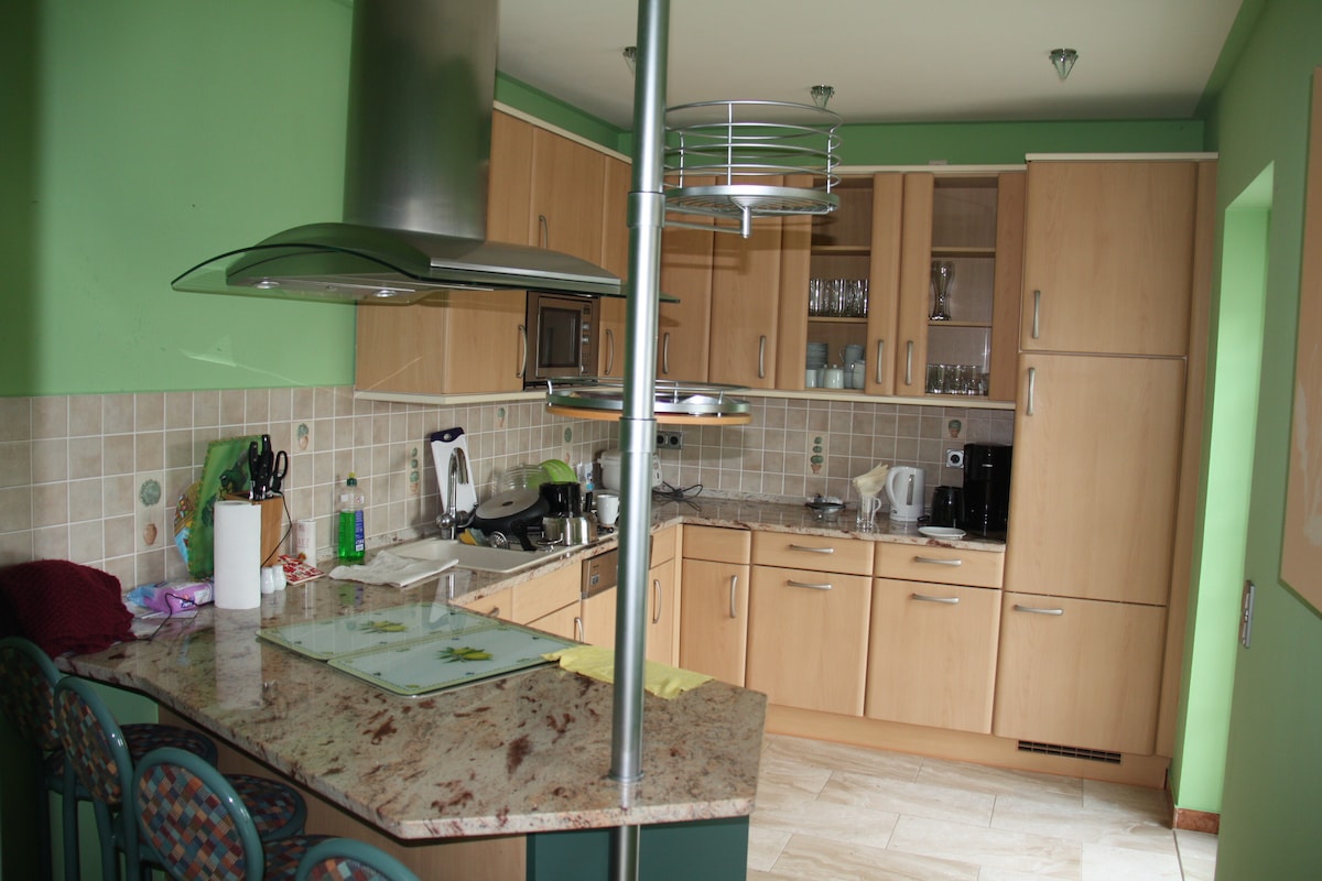 Gemütliche 2-Etagen-FeWo (75 Quadratmeter) mit Kinderzimmer bzw. 2.Schlafzimmer, Schlafzimmer, Esszimmer, Küche , Bad und Wohnzimmer. Wohnzimmer und ein Schlafzimmer befindet sich im 2.OG, der Rest in der 1.Etage. Kinderreisebett und Kinderstuhl wird bei Bedarf kostenfrei gestellt. Der öffentliche Spielplatz befindet sich nur 100m entfernt.Im Garten befindet sich eine kl. Sitzecke. Grill ist auch vorhanden. WLAN ist vorhanden. Die Wohnung ist komplett abgeschlossen und zur alleinigen Nutzung.