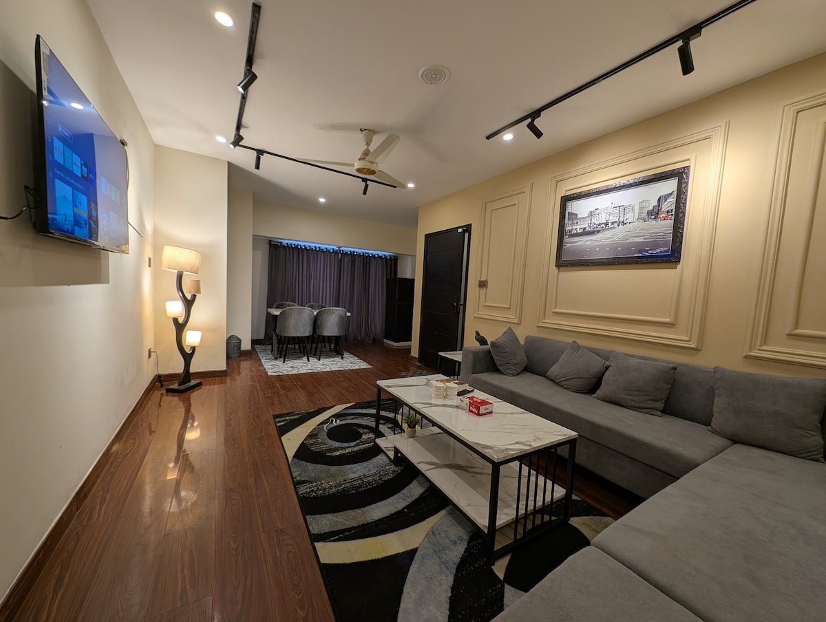 • Plassert inne i Zeta Mall – gå ned for å handle, ta en kaffe eller nyte en middag (mathall) uten å forlate bygningen. • Super sentralt – nær store områder, som DHA 2–6 og Bahria Town 1–8 • Fullt møblert med komfortabelt sengetøy, en koselig stue og en smart-TV. • Utstyrt kjøkken – lag dine egne måltider når du vil. • Trådløst nettverk med høy hastighet for jobb eller underholdning. • Trygt, sikkert miljø med døgnåpen sikkerhet. • tilgang til basseng og treningsstudio