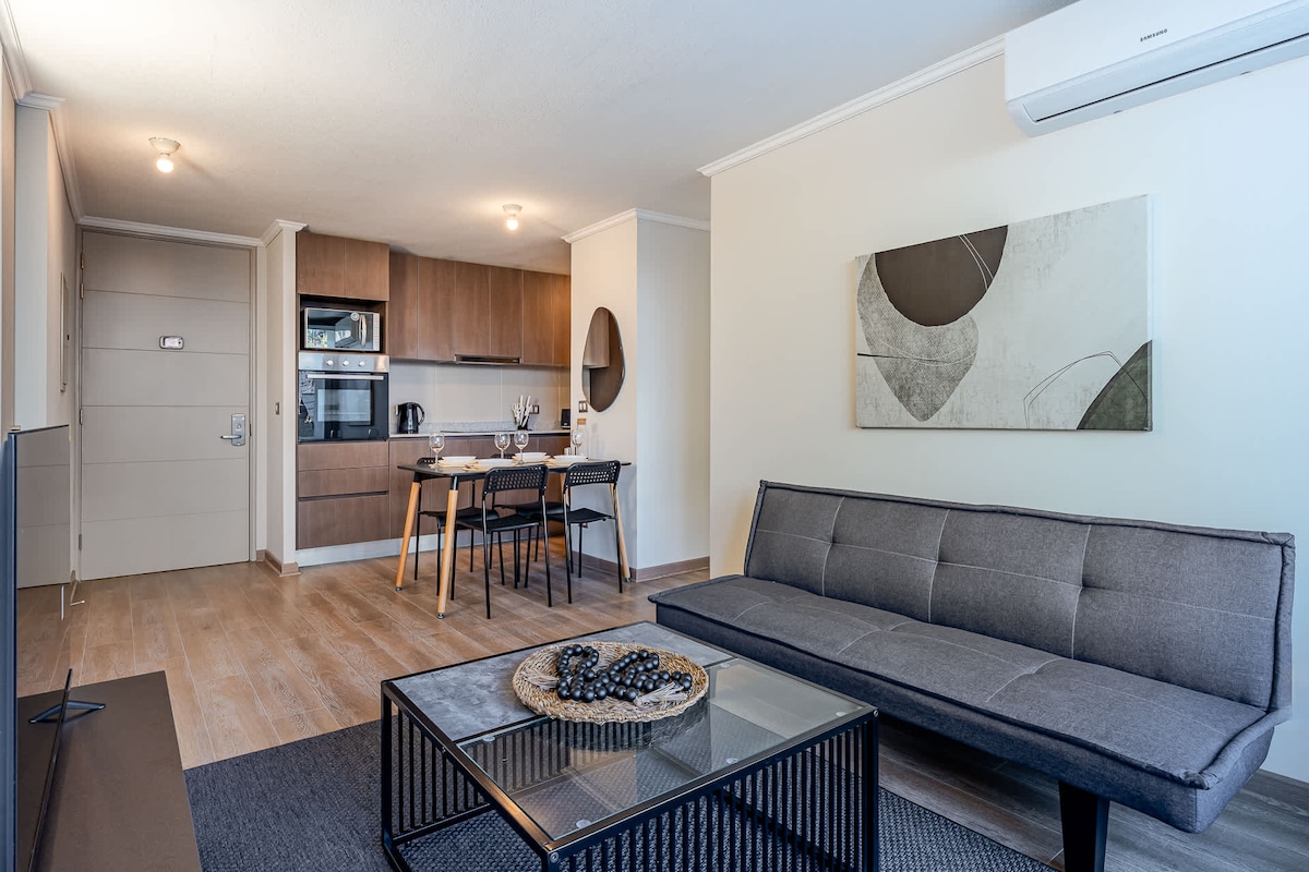Moderne leilighet med en vakker utsikt mot fjellkjeden. 🤍 Ligger i et sentralt og rolig område, ett kvartal fra Conchalí T-bane, 15 minutter fra flyplassen, 10 minutter fra sentrum i Santiago og mindre enn fem minutters gange fra Chile Racecourse og Santa Laura Stadium. Ett soverom og sovesofa i stuen. Utstyrt kjøkken Privat bad Balkong med utsikt over fjellkjeden Trådløst nettverk og TV med apper Fullt utstyrt. Moderne, komfortabelt og minimalistisk Svømmebasseng, treningsstudio, quincho, kontorfellesskap og arrangementsrom