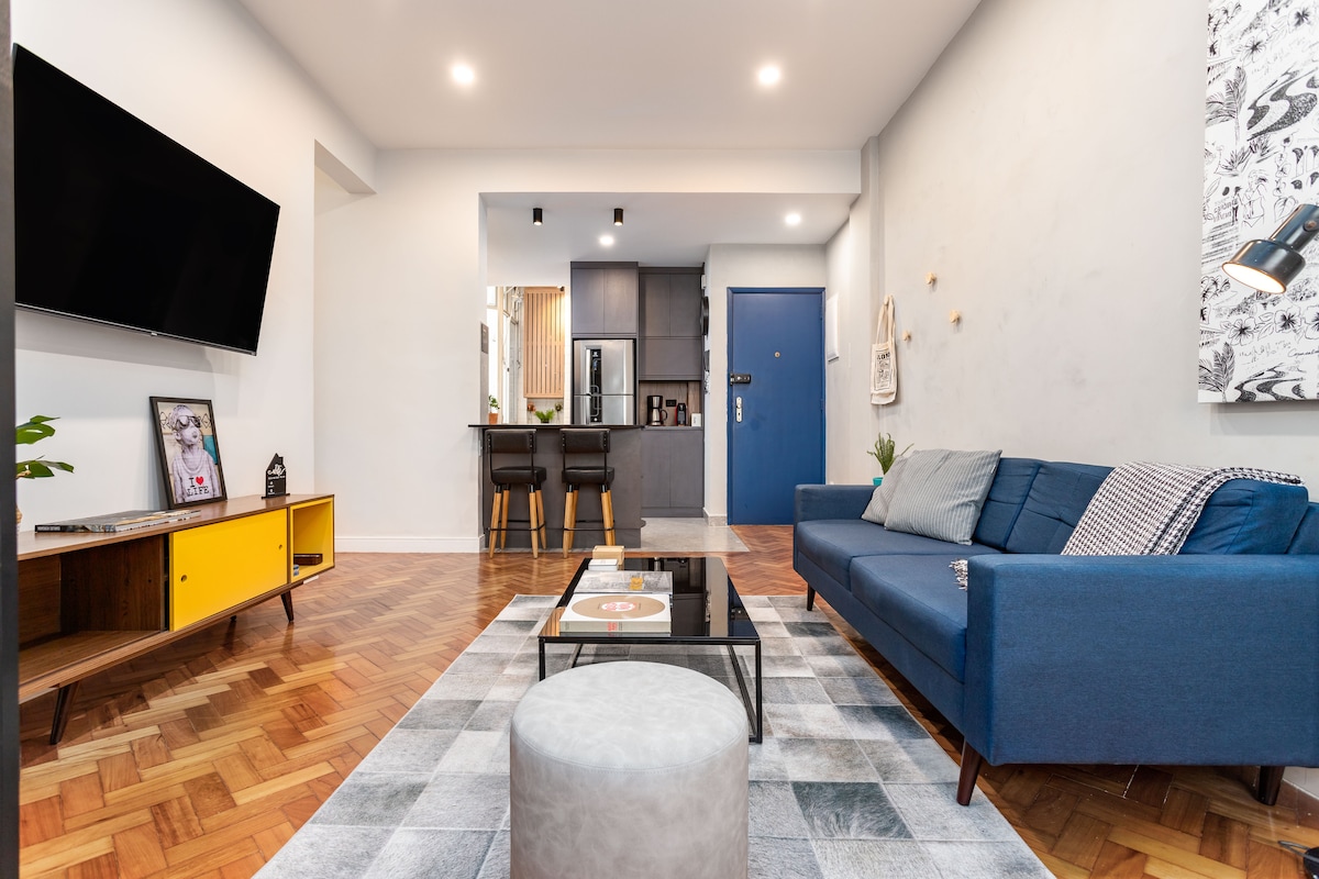 Boho chic stil leilighet, på Copacabana-stranden! - queensize-seng, sovesofa, spisebord, klimaanlegg og plass til hjemmekontor (trådløst nettverk 300 Mbps). Kjøkken med komfyr, kjøleskap, stekeovn, mikrobølgeovn, blender, kaffetrakter, juicemaskin, sandwichmaskin, panner, kjøkkenredskaper, forskjellige bøker, gitar og TV med apper. - Marked og apotek under bygningen, restauranter og butikker rundt leiligheten. - flyplass på 8,3 km - Cristo Redentor på 11,5 km - Pão de Açúcar på 2,8 km