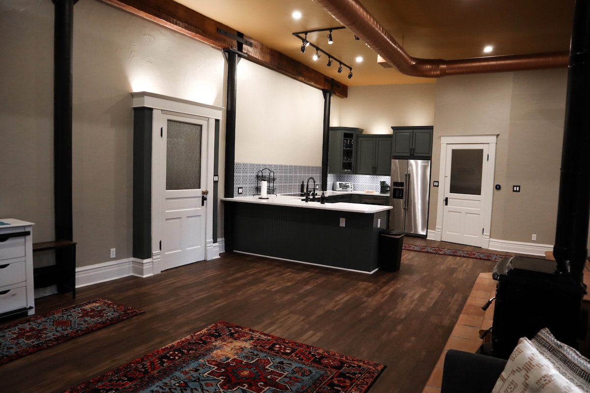 Denne loftsleiligheten ligger i den vakkert restaurerte bygningen fra 1916. Enheten har en queensize-seng, fullt utstyrt kjøkken, et kjøkkenbord for to og et glamorøst flislagt bad med dusj. Det er et koselig luksusopphold i art deco-stil, der 1920-tallet møter 2020-tallet. Merk: Loftsleiligheten er kun tilgjengelig via trapp. På grunn av byggearbeid er 1st Street stengt for kjøretøy, men fortauet og offentlig parkering i nærheten er fortsatt tilgjengelig.